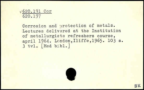 Corrosion and protection of metals. Lectures delivered at the Institution of metallurgists refreshers course, april 1964.