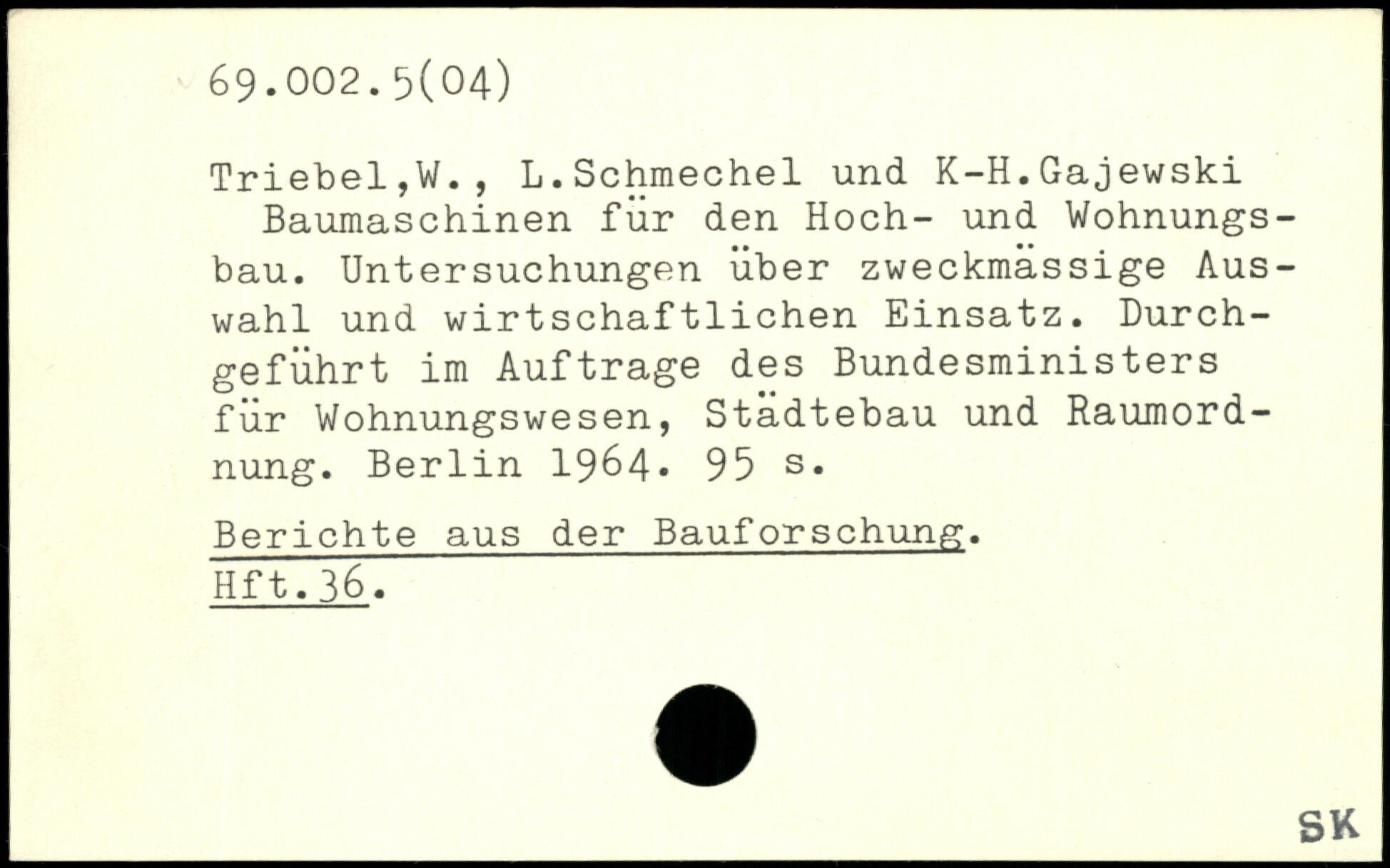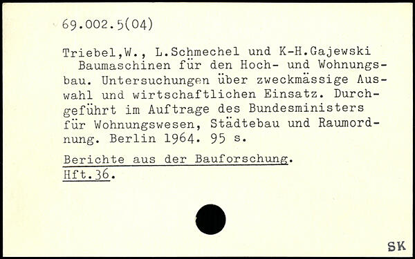 Triebei,W., L.Schmechel und K-H.Gajewski Baumaschinen für den Hoch- und Wohnungsbau. Untersuchungen über zweckmassige Auswahl und wirtschaftlichen Einsatz. Durchgeführt im Aufträge des Bundesministers für Wohnungswesen, Städtebau und Raumordnung.