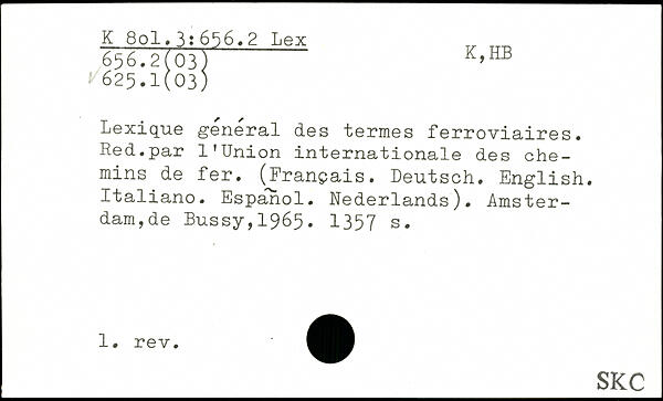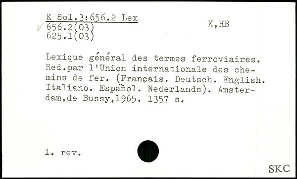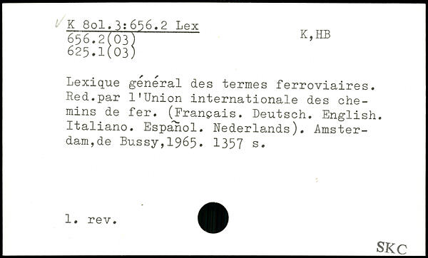 Lexique general des termes ferroviaires. Red.par l’Union internationale des chemins de fer. (Français. Deutsch. English. Italiano. Espanol. Nederlands). Amsterdam,de Bussy,1965.