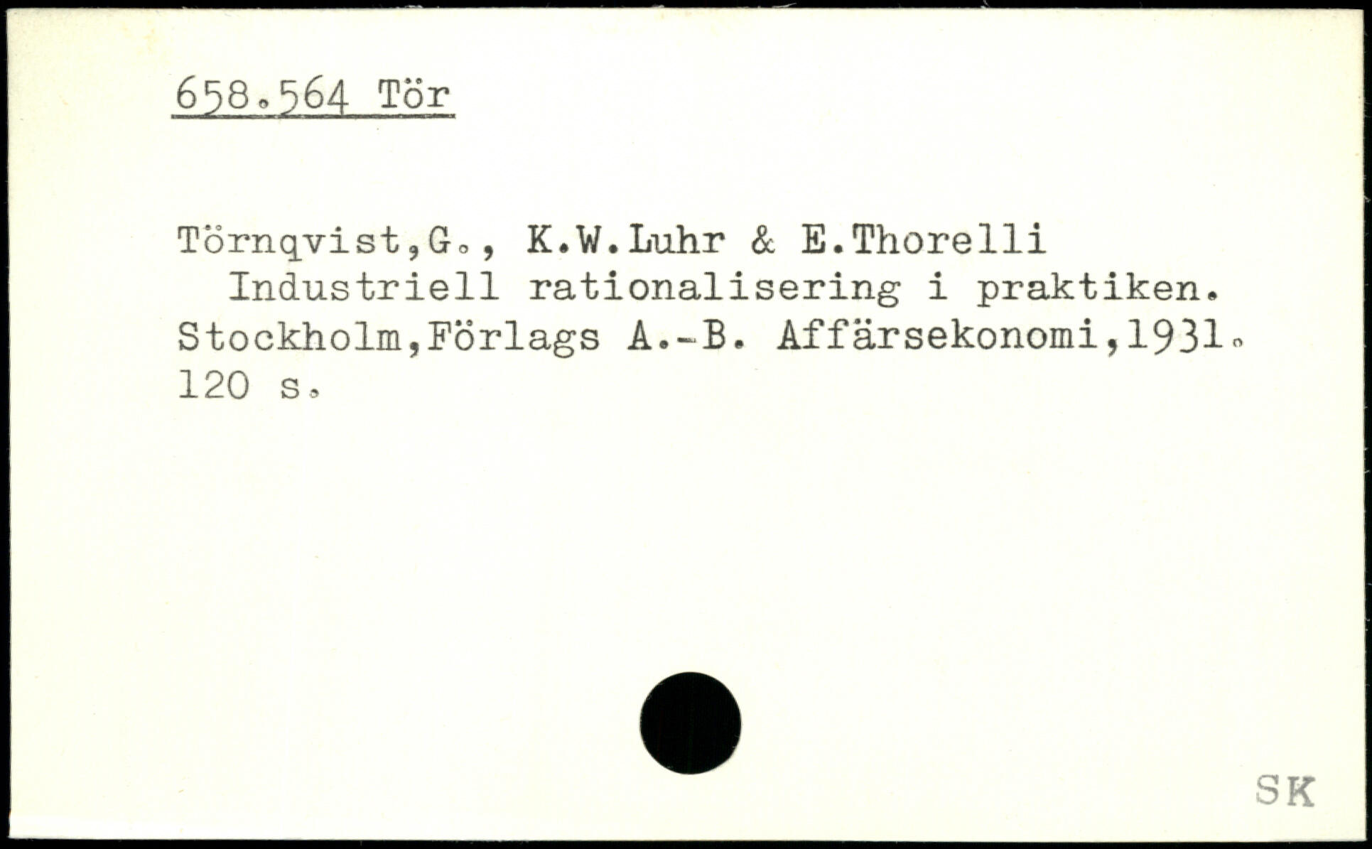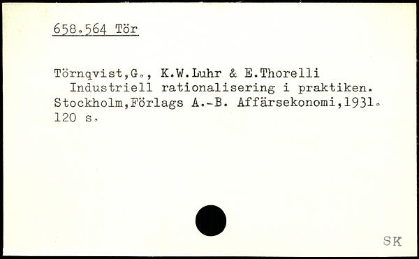 Törnqvist, G, , K.W.Luhr ,5c E.Thorelli Industriell rationalisering i praktiken. Stockholm,Förlags A.-B. Affärsekonomi,1931