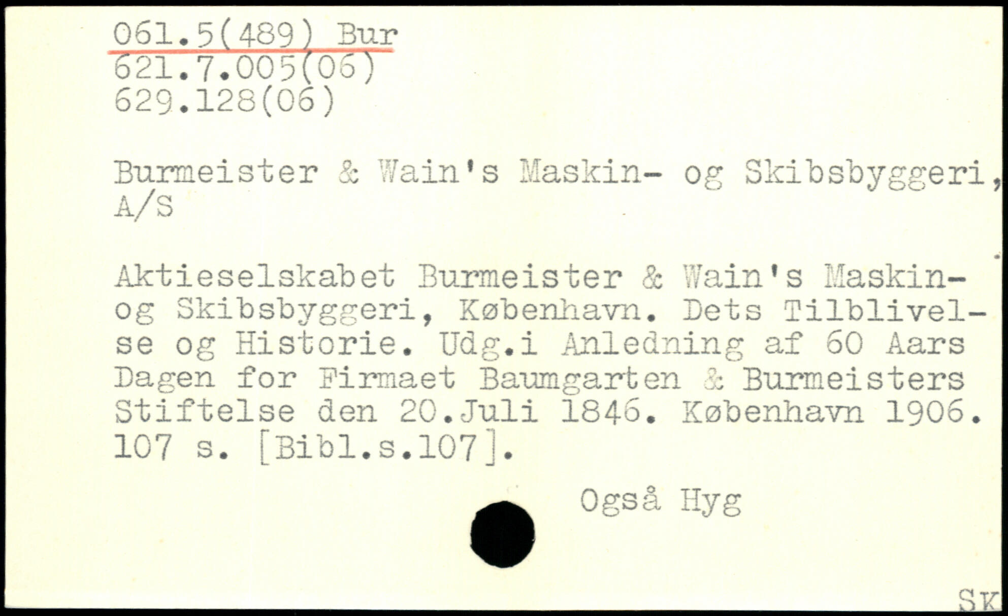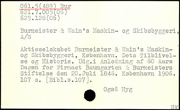 Burmeister & Wain's Maskin- og Skibsbyggeri, Aktieselskabet Burmeister & Wain's Maskin-og Skibsbyggeri, København. Dets Tilblivelse og Historie. Udg.i Anledning af 60 Aars Dagen for Firmaet Baumgarten B Burmeisters Stiftelse den 20.Juli 1846.