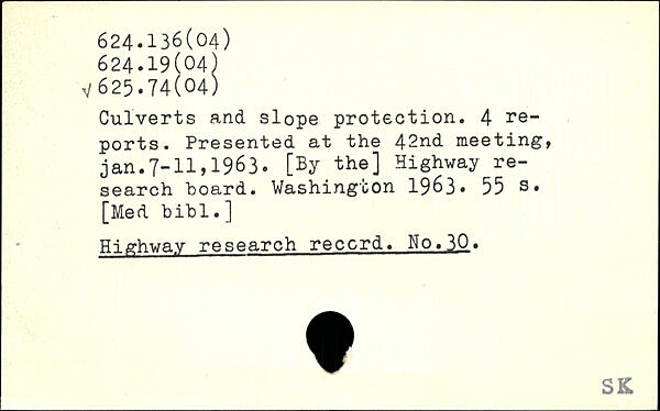 Culverts and slope protection. 4 reports. Presented at the 42nd meeting. jan.7-11,1963. [By the] Highway research board. Washington 19^3.