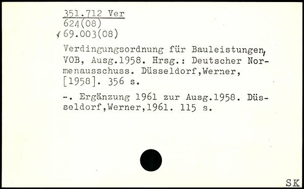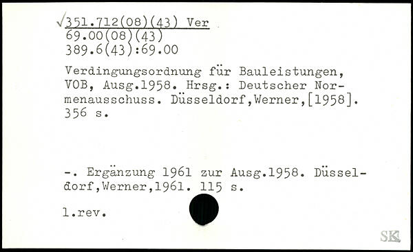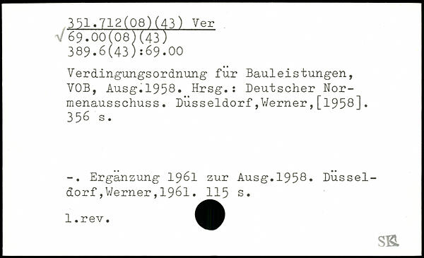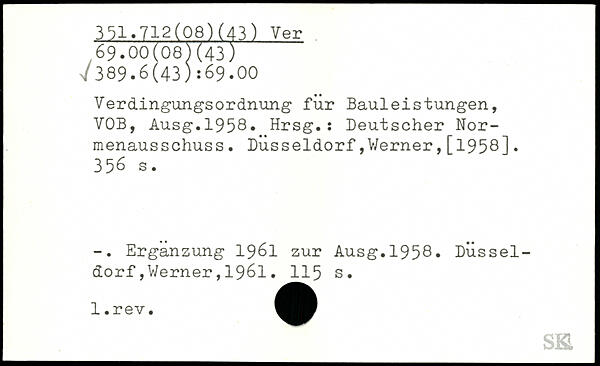 Verdingungsordnung. für Bauleistungen, VOB, Ausg.1958. Hrsg.: Deutscher Normenausschuss.