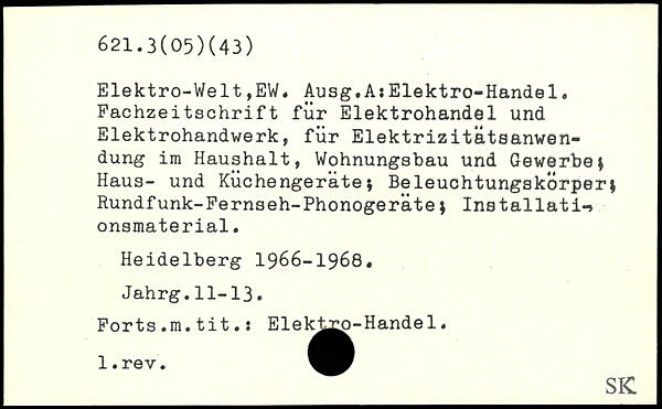 Elektro-Welt,EW. Ausg.As Eiektro-Hände 1. Fachzeitschrift für Elektrohandel und Elektrohandwerk, für Elektrizitatsanwen-dung im Haushalt, Wohnungsbau und Gewerbe $ Haus- und Küchengeräte; Beleuchtungskörper; Rundfunk-Fernseh-Phonogeräte; Installati.. onsmaterial. Heidelberg 1966-1968. Jahrg.11-13. Forts .m. tit. i Elel^jo-Handel. l.rev.