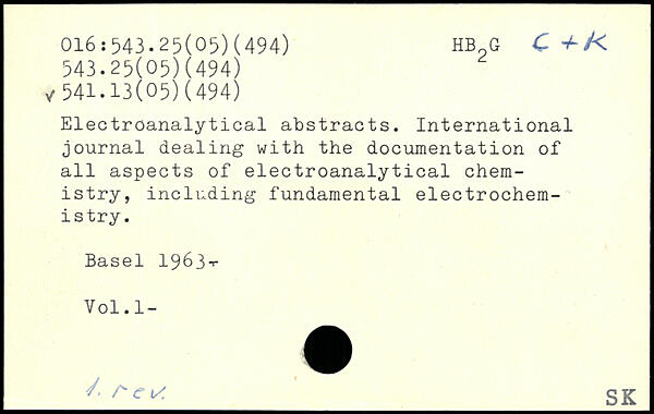 Electroanalytical abstracts. International journal dealing with the documentation of all aspects of electroanalytical chemistry, including fundamental electrochemistry.