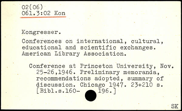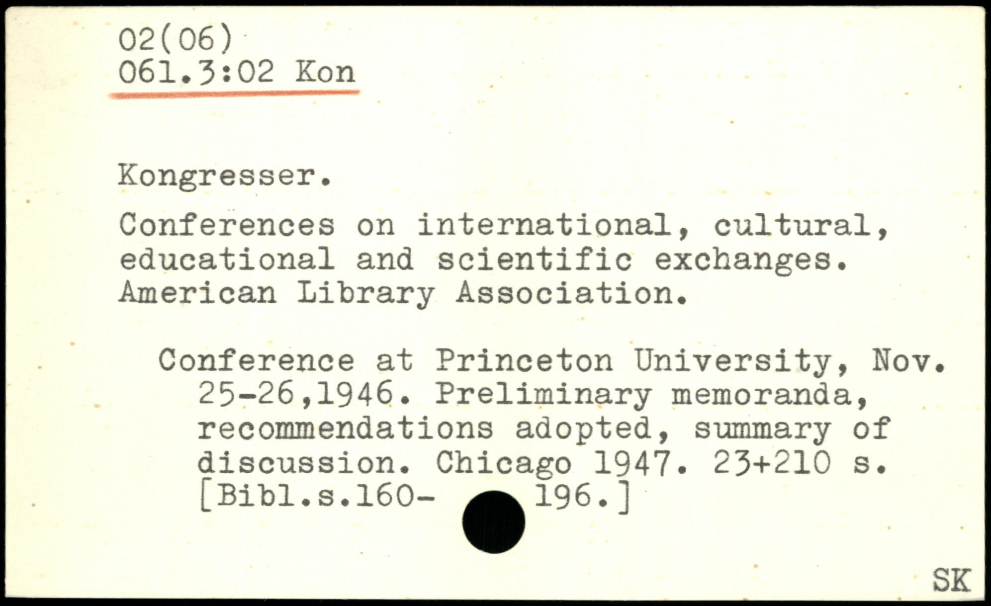 061.3:02 Kon Kongresser. Conferences on international, cultural, educational and scientific exchanges. American Library Association. Conference at Princeton University, Nov. 25-26,1946. Preliminary memoranda, recommendations adopted, summary of discussion.