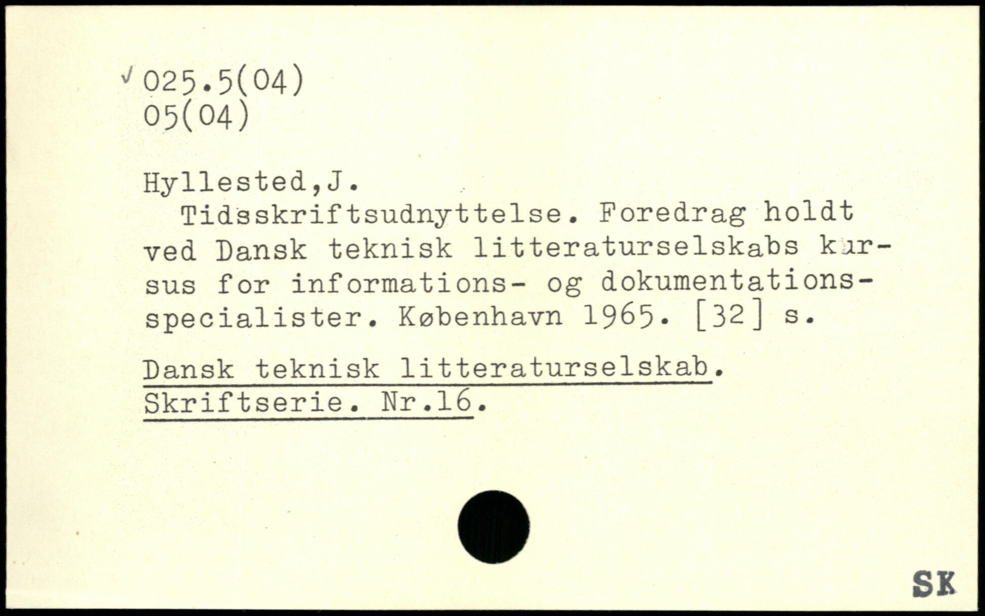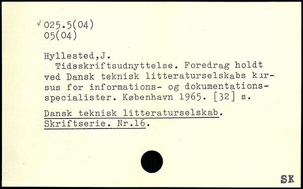 Tidsskriftsudnyttelse. Foredrag holdt ved Dansk teknisk litteraturselskabs kar-sus for informations- og dokumentationsspecialister. København 19^5, [32] s. Dansk teknisk litteraturselskab. Skriftserie. Nr.l6.