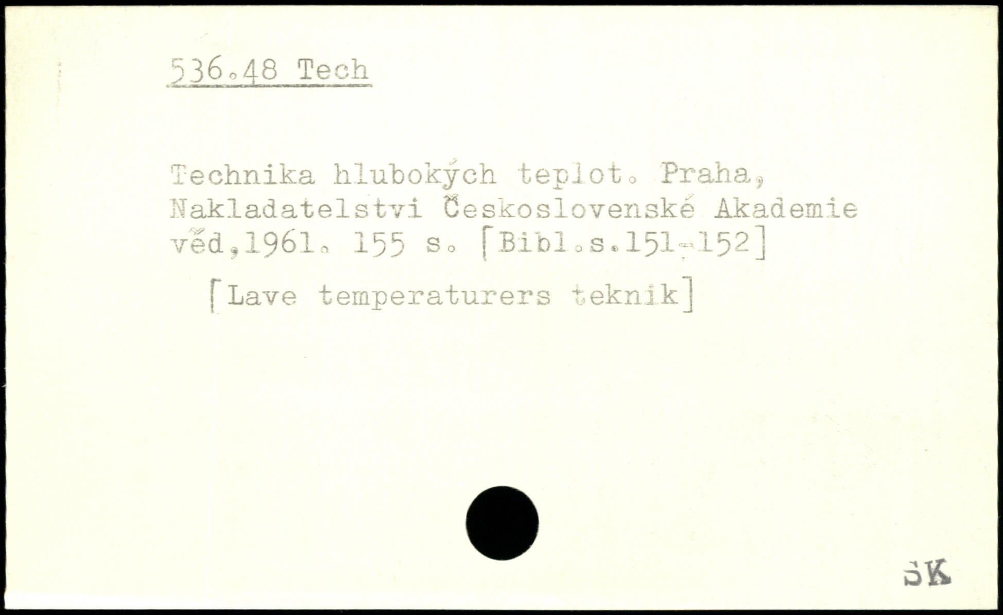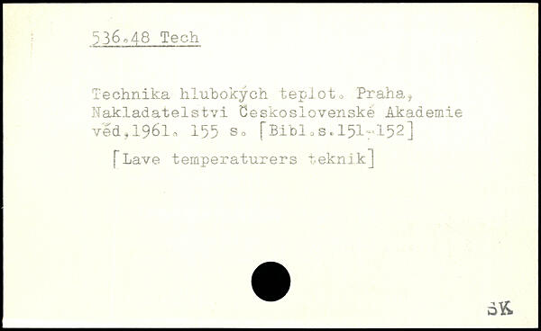 Technika hlubokych tepioto Praha, Nakladatelstvi Seskoslovenske Akademie ved,1961, 155 so fBibl=s.l51r152] Lave temperaturers teknik]