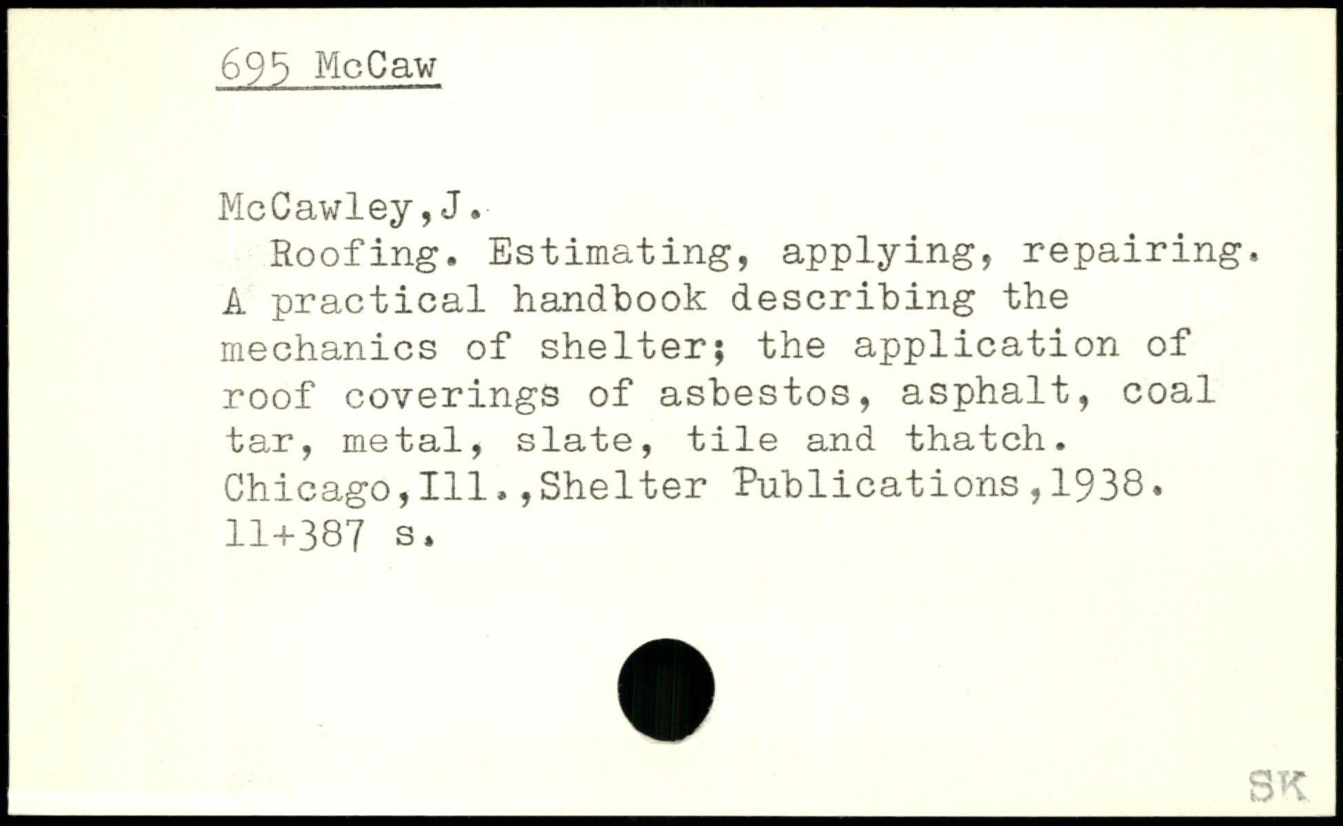 Roofing. Estimating, applying, repairing. A practical handbook describing the mechanics of shelter; the application of roof coverings of asbestos, asphalt, coal tar, metal, slate, tile and thatch. Chicago,111.,Shelter Publications,1938.