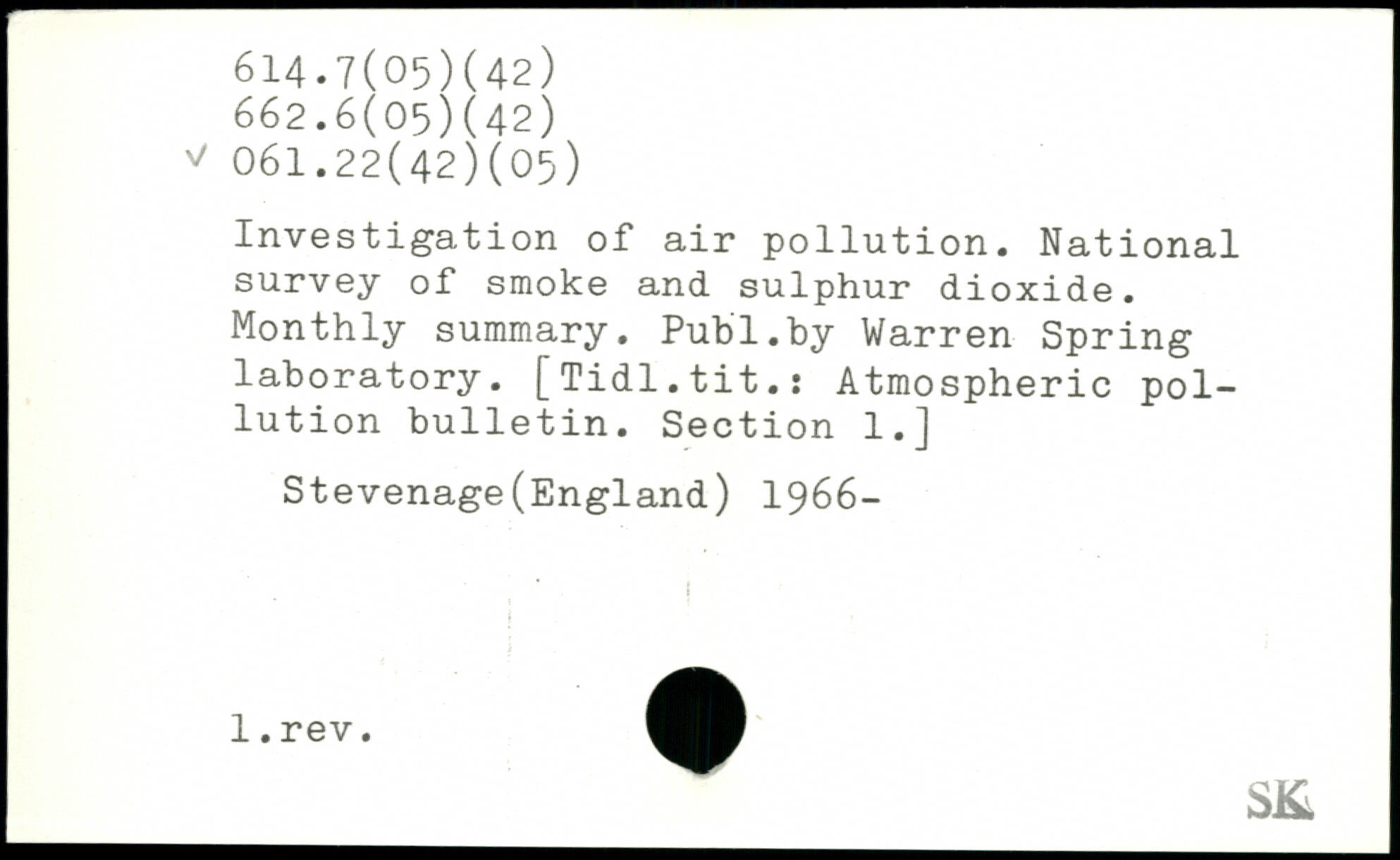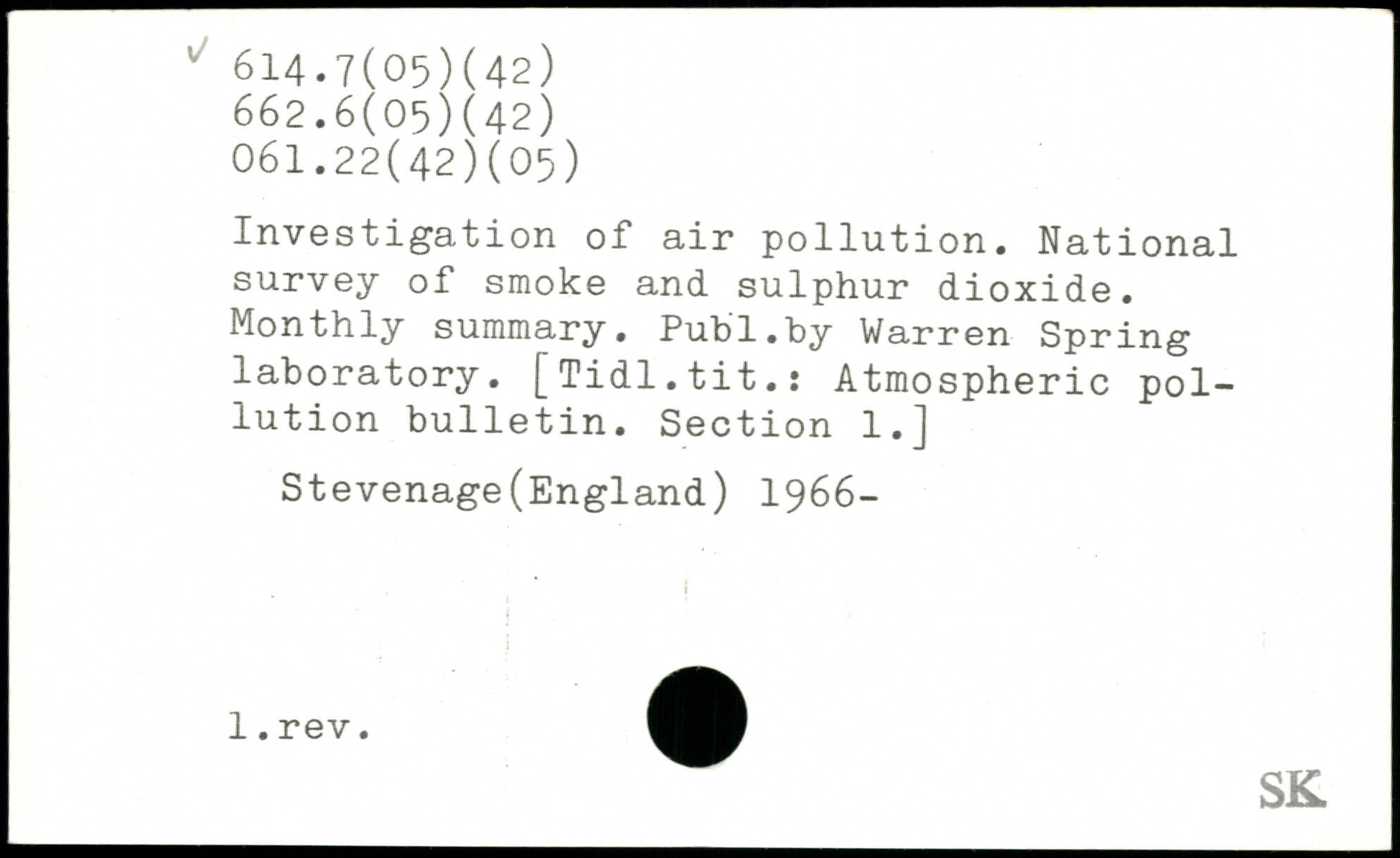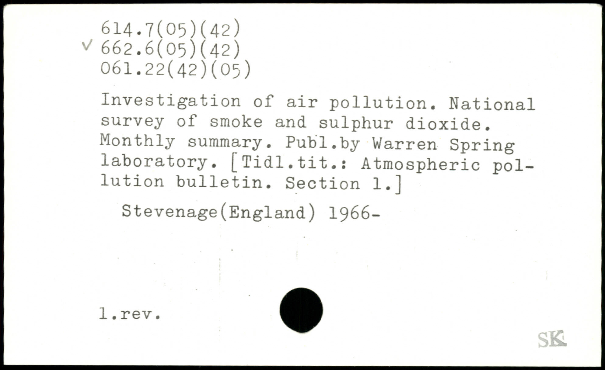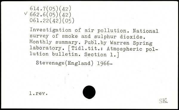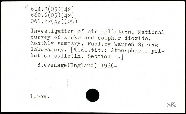Investigation of air pollution. National survey of smoke and sulphur dioxide. Monthly summary.