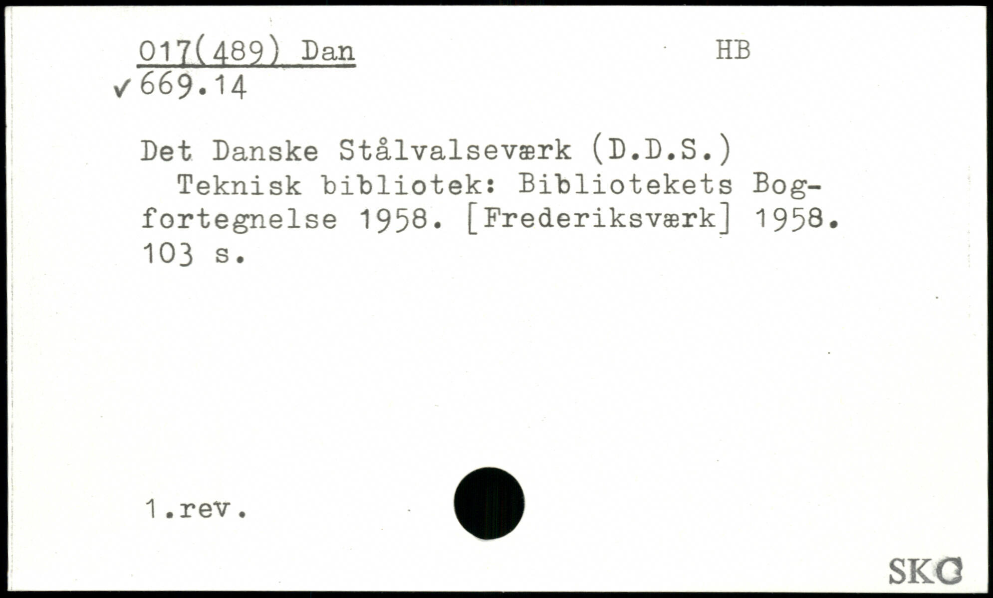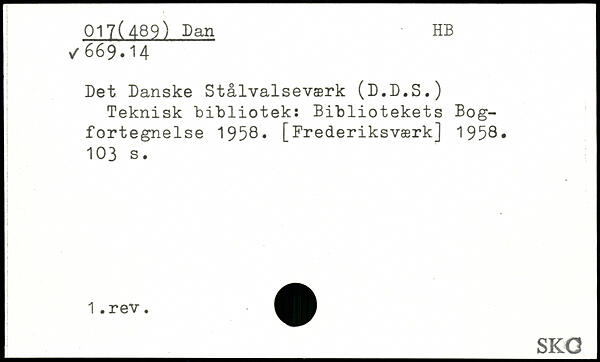 Det Danske Stålvalseværk (D.D.S.) Teknisk Bibliotek: Bibliotekets Bogfortegnelse 1958. [Frederiksværk] 1958
