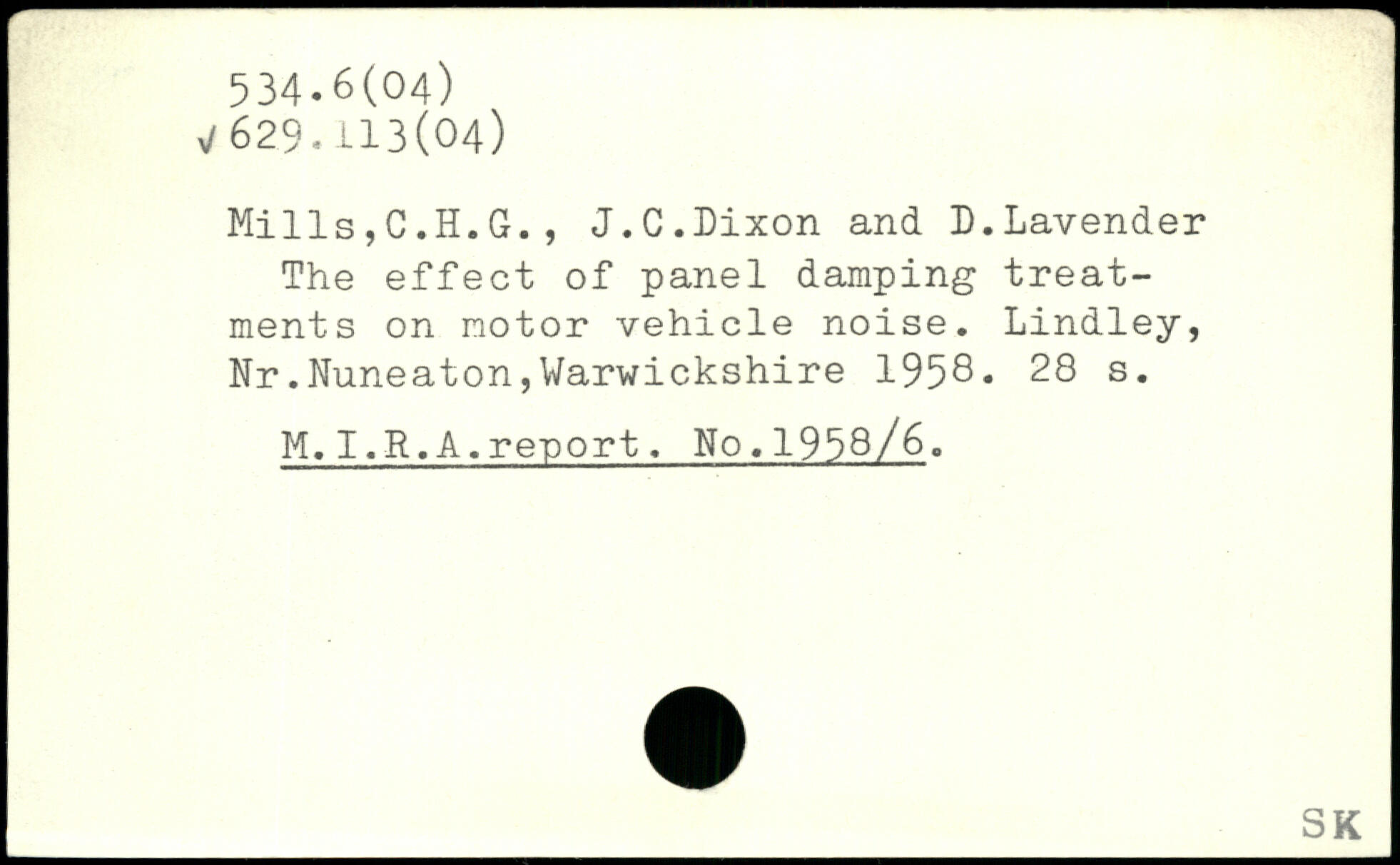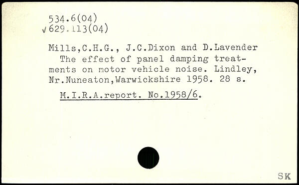 Mills,C.H.G., J.C.Dixon and D.Lavender The effect of panel damping treatments on motor vehicle noise. Lindley, Nr.Nuneaton,Warwickshire 1958.