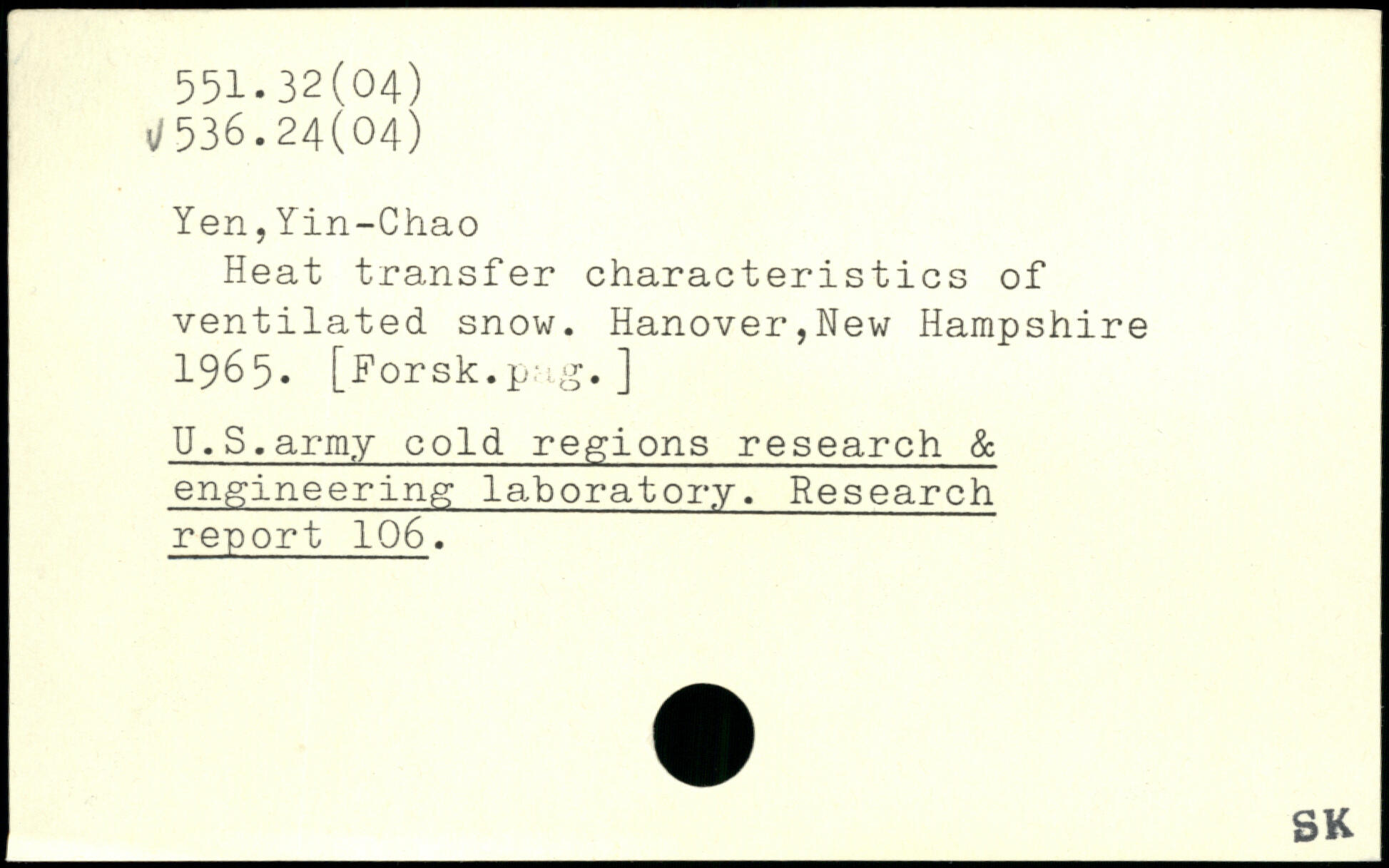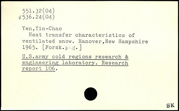 Heat transfer characteristics of ventilated snow. Hanover,New Hampshire 1965. [Forsk.p ;g. ] U.S.army cold regions research & engineering laboratory. Research report 106.