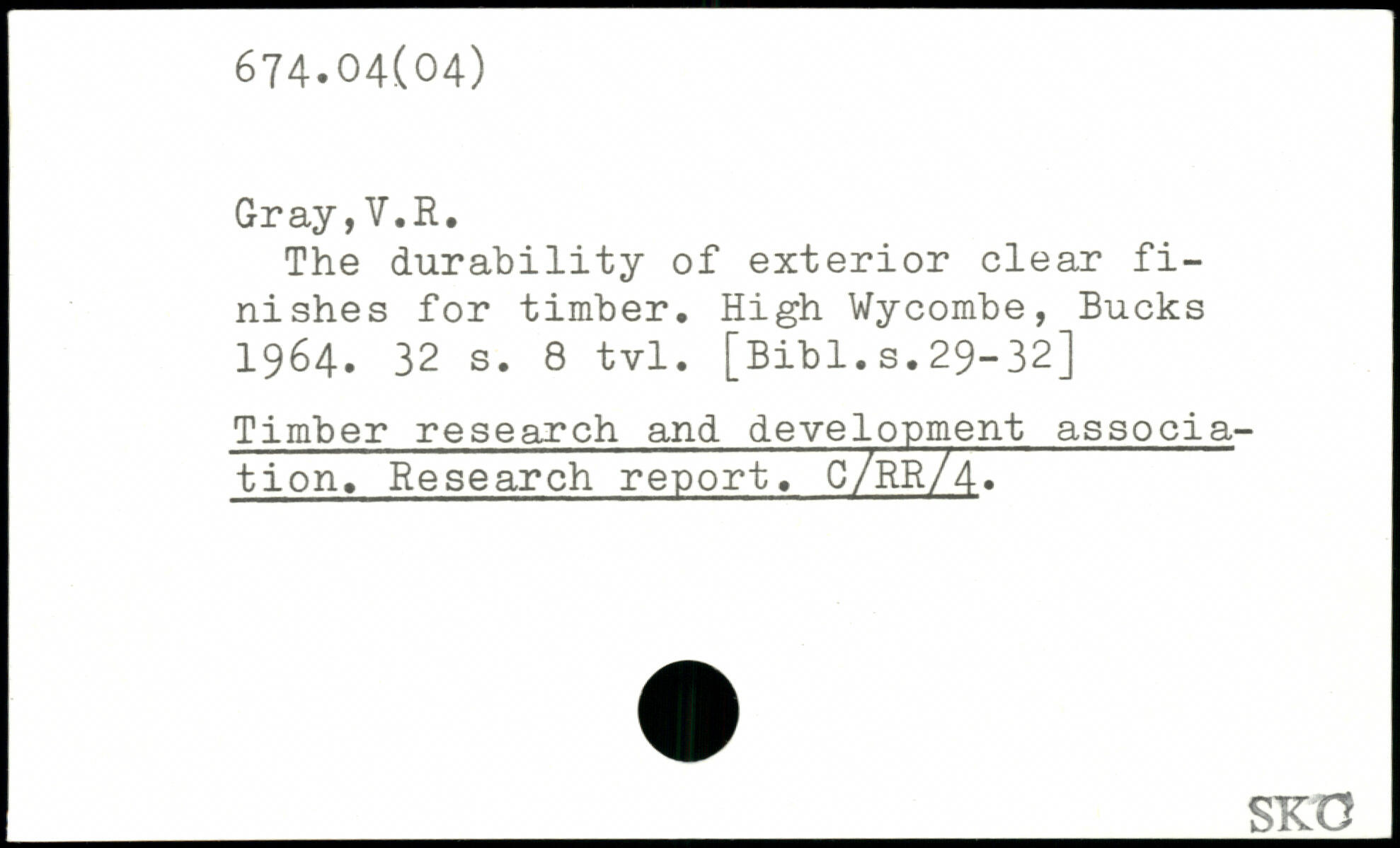 The durability of exterior clear finishes for timber. High Wycombe, Bucks 1964.