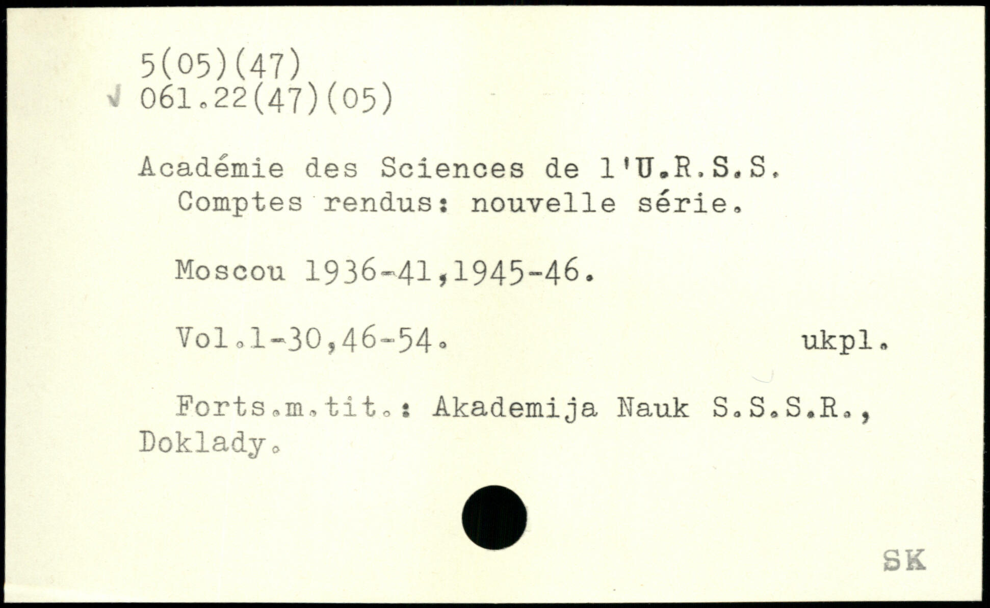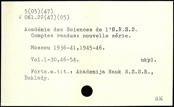 Académie des Sciences de l'U.R.S.S. Comptes rendus: nouvelle série. Moscou 1936-41,1945-46. Volol-30,46-54, ukpl. Forts.m.tito: Akademija Nauk S.S.S.R., Doklady0