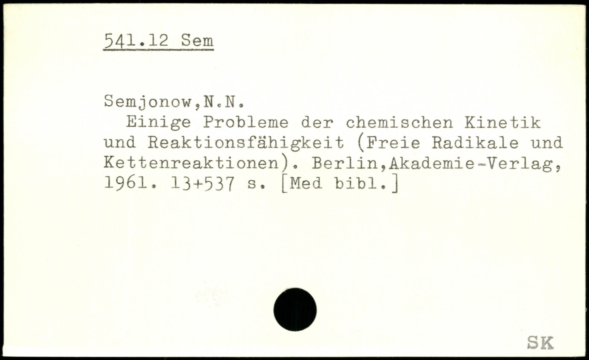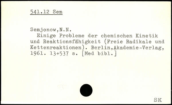 Einige Probleme der chemischen Kinetik und Reaktionsfähigkeit (Freie Radikale und Kettenreaktionen). Berlin,Akademie-Verlag. 1961.