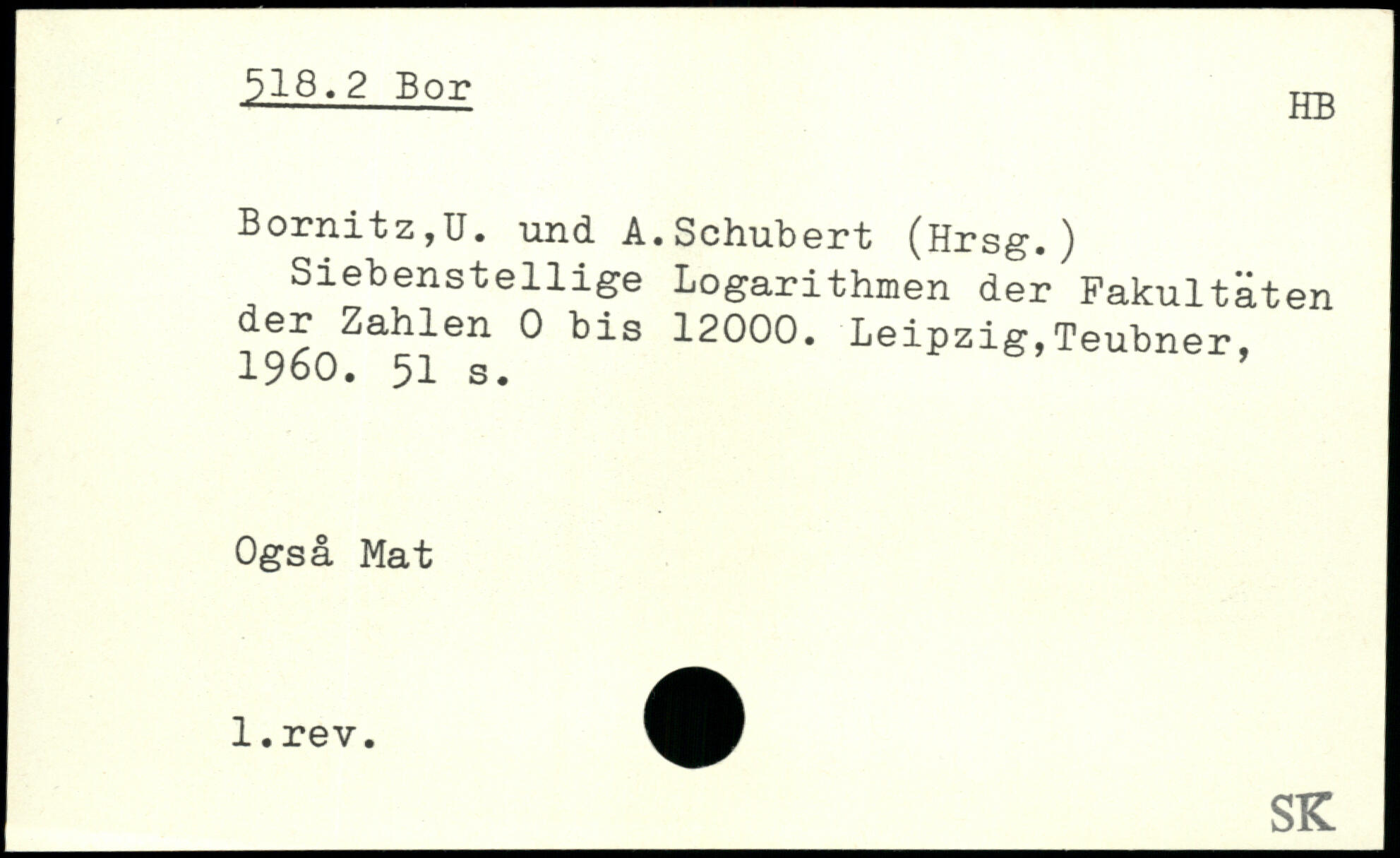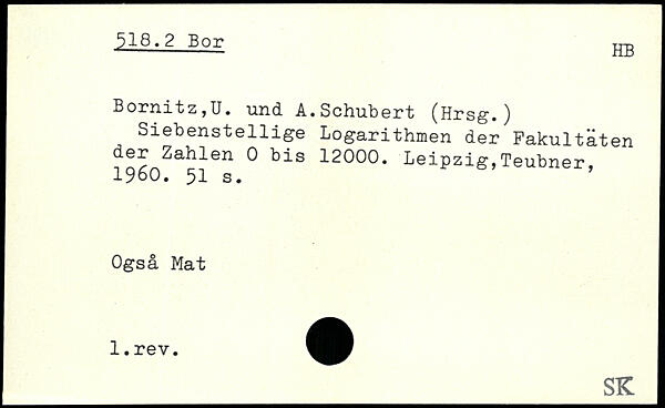 Siebenstellige Logarithmen der Fakultäten ,-Zahlen 0 bis 12000. Leipzig, Teubner, Også Mat