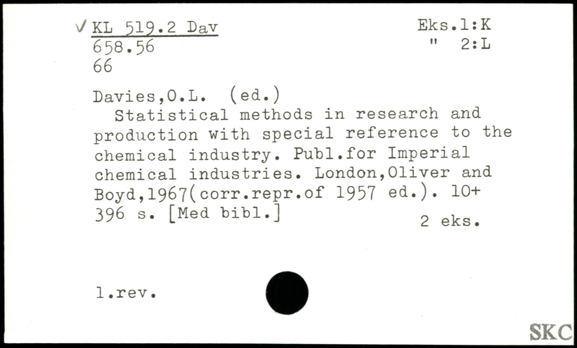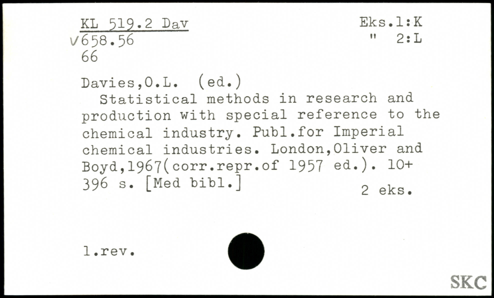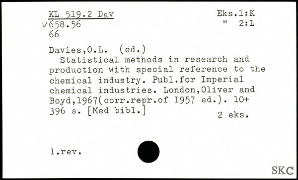 Statistical methods in research and production with special reference to the chemical industry. Publ.for Imperial chemical industries.