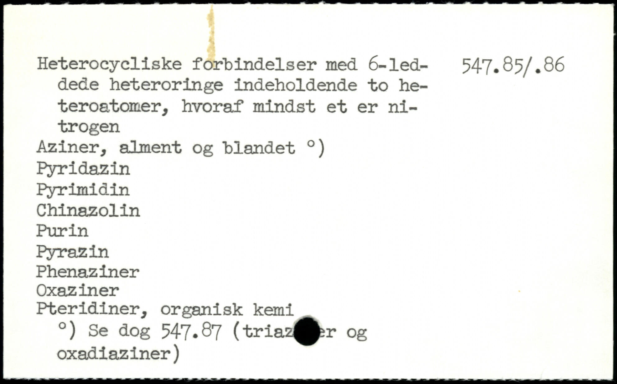 Heterocycliske forbindelser med 6,led- 547.85/.86 dede heteroringe indeholdende to he-teroatomer, hvoraf mindst et er nitrogen Aziner, alment og blandet .) Pyridazin Pyrimidin Chinazolin Purin Pyrazin Phenaziner Oxaziner Pteridiner, organisk kemi .) Se dog 547.87 (tria2^r og oxadiaziner)