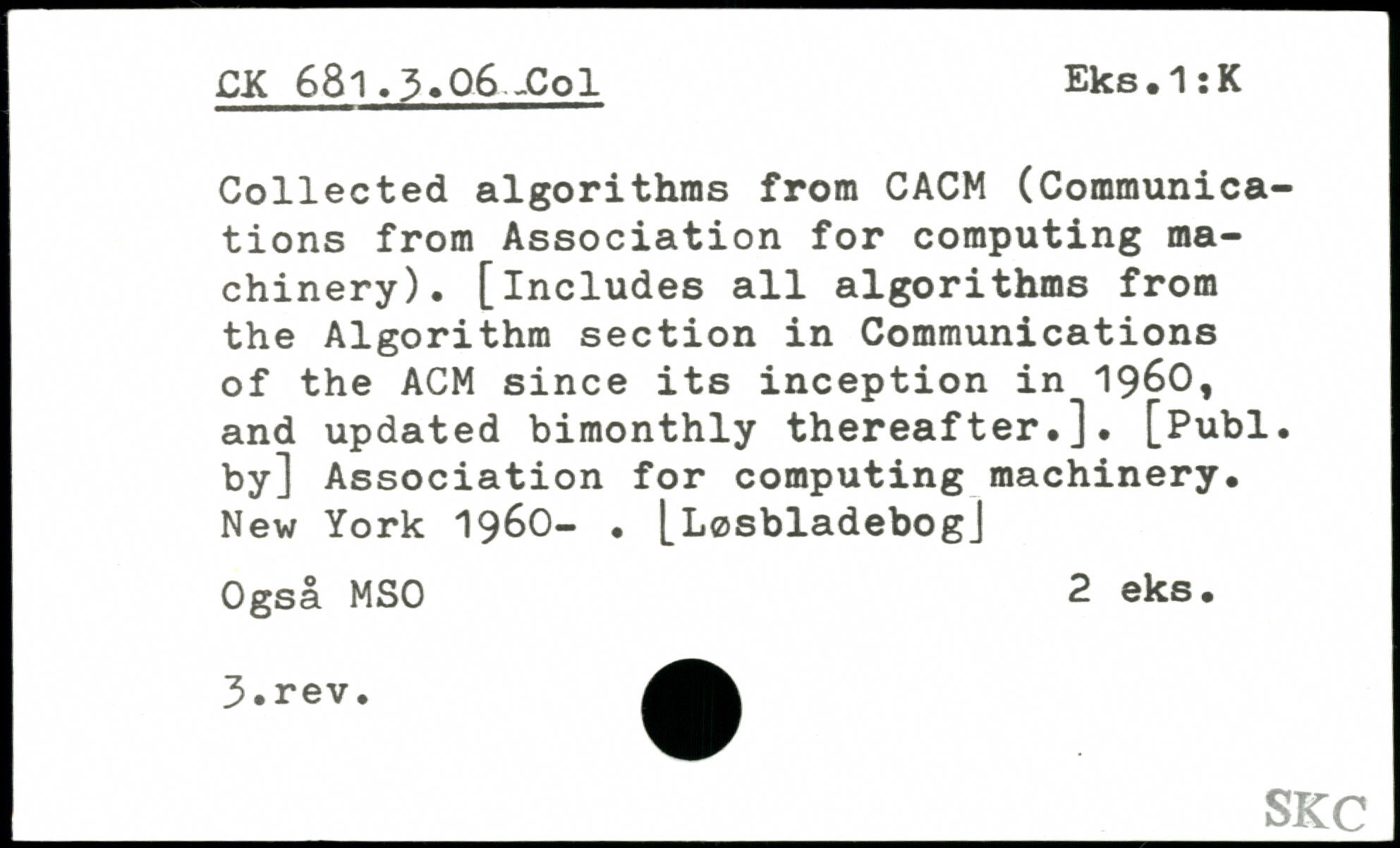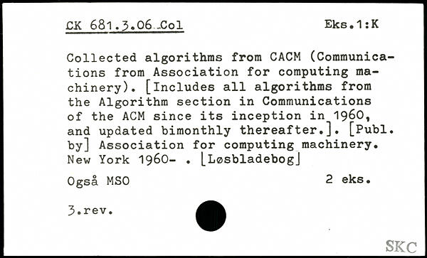 Collected algorithms from CACM (Communications from Association for computing machinery). [includes all algorithms from the Algorithm section in Communications of the ACM since its inception in 1960, and updated bimonthly thereafter.].