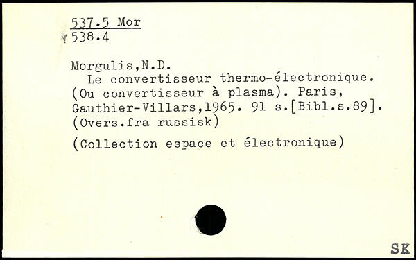 Le convertisseur thermo-électronique. (Ou convertisseur à plasma). Paris, Gauthier-Villars,19é5.