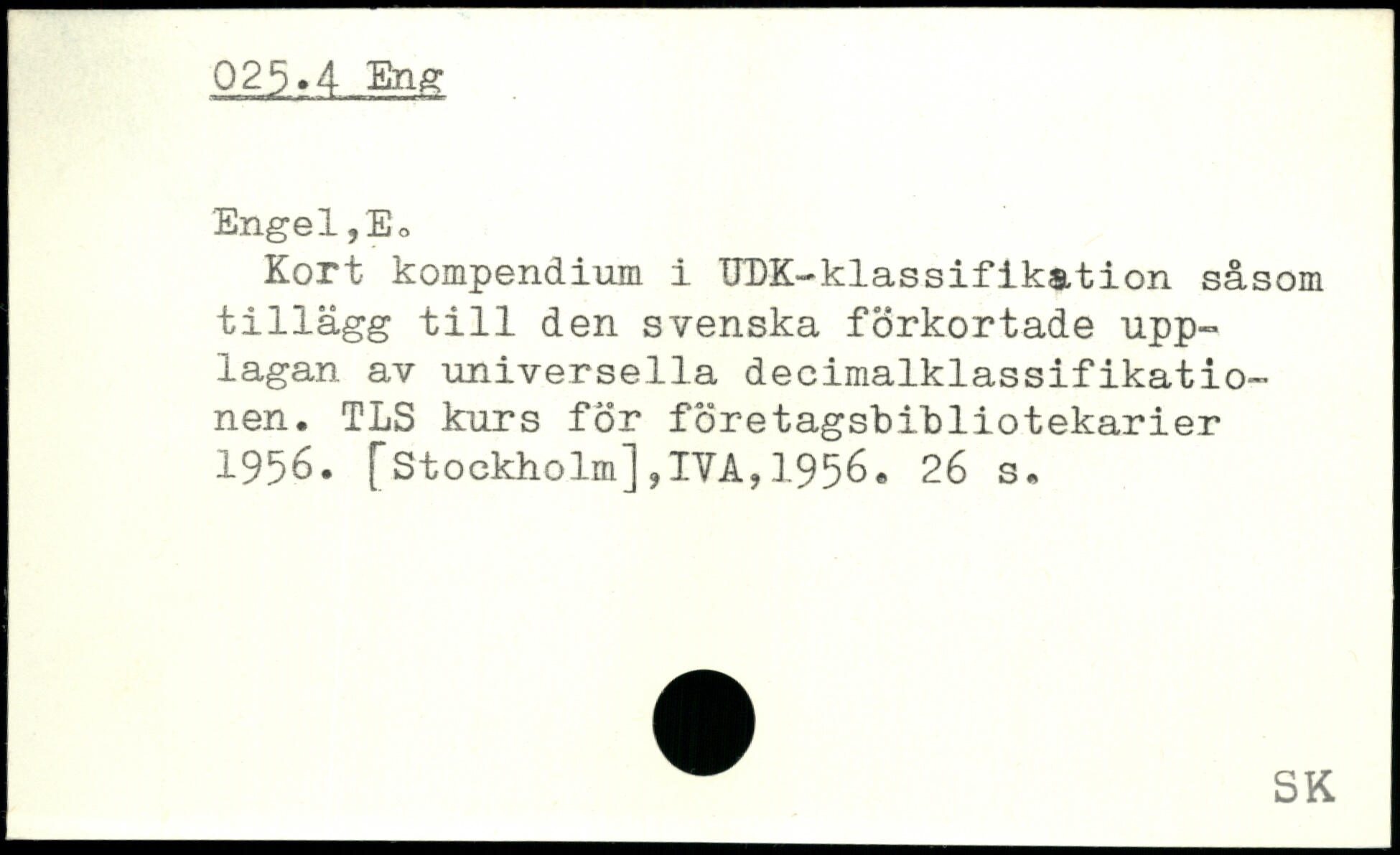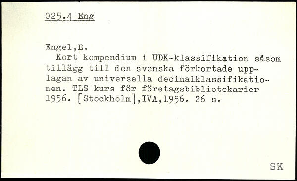 Kort- kompendium i UDK-klassifikation såsom tillägg till den svenska förkortade upplagan av universella decimalklassifikationen. TLS kurs för företagsbibliotekarier 1956. [Stockholm],IVA,1956