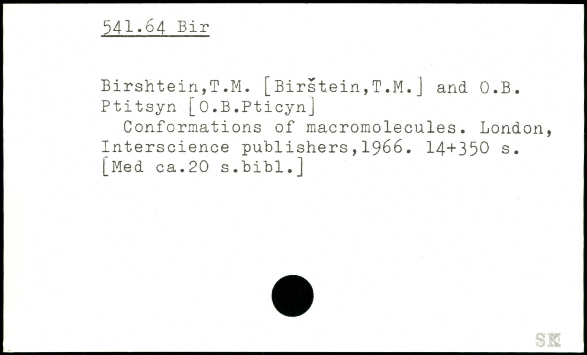 Birshtein,T.M. [Birstein,T.M.] and O.B. Ptitsyn [O.B.Pticyn] Conformations of macromolecules.