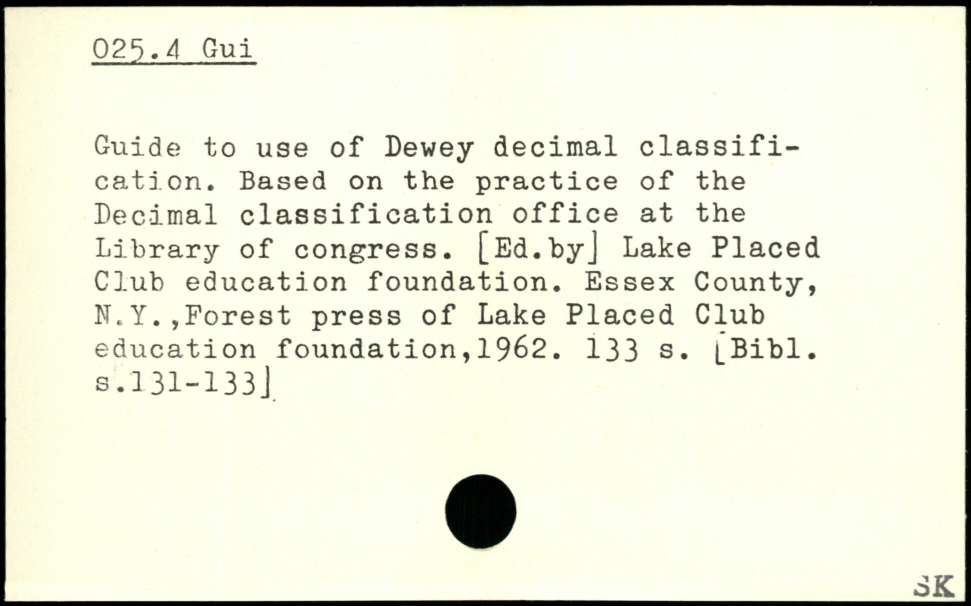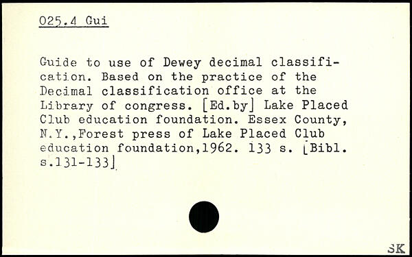 Guide to use of Dewey decimal classification. Based on the practice of the Decimal classification office at the Library of congress. [Ed.by] Lake Placed Club education foundation. Essex County, N.Y.,Forest press of Lake Placed Club education foundation,1962.