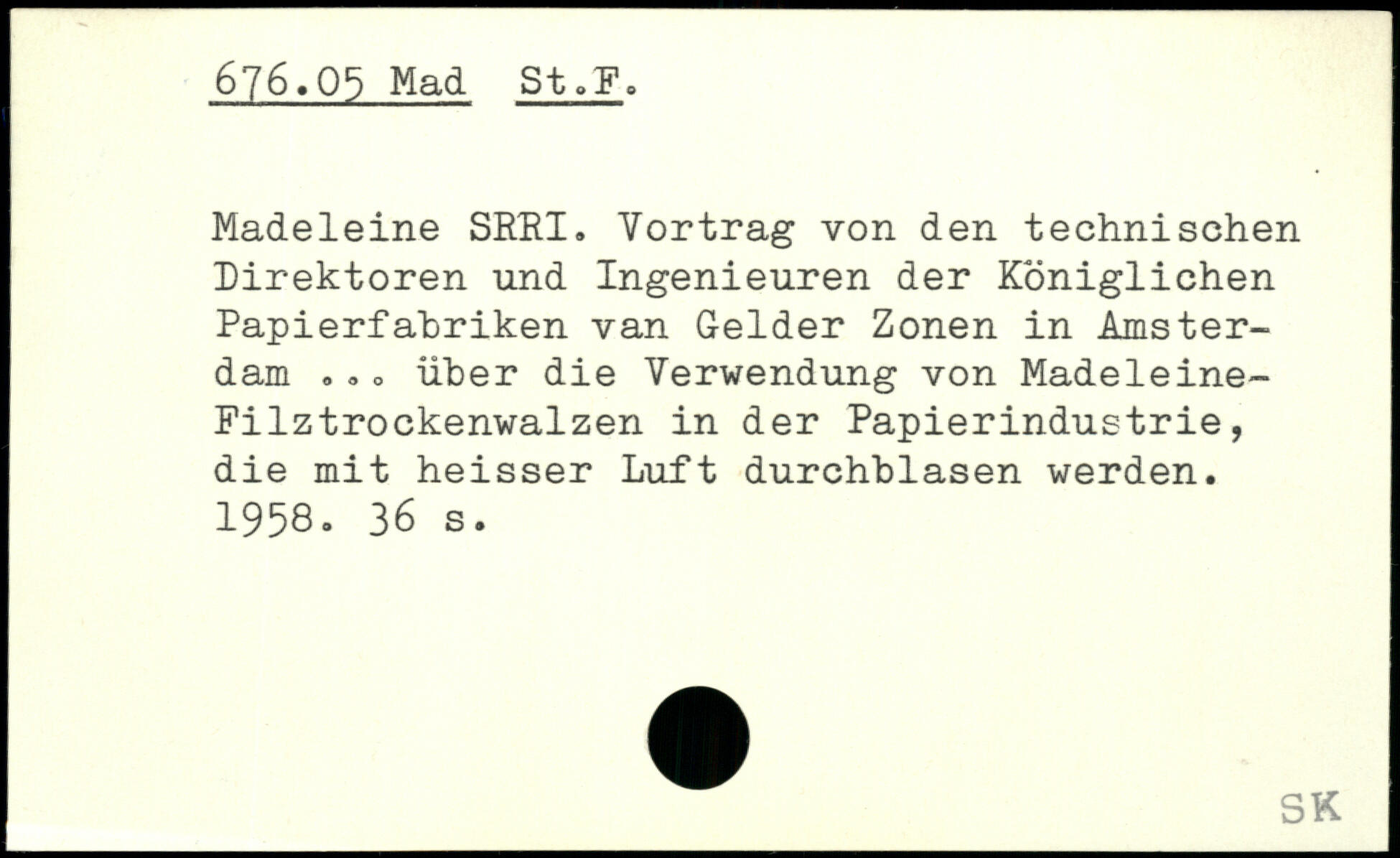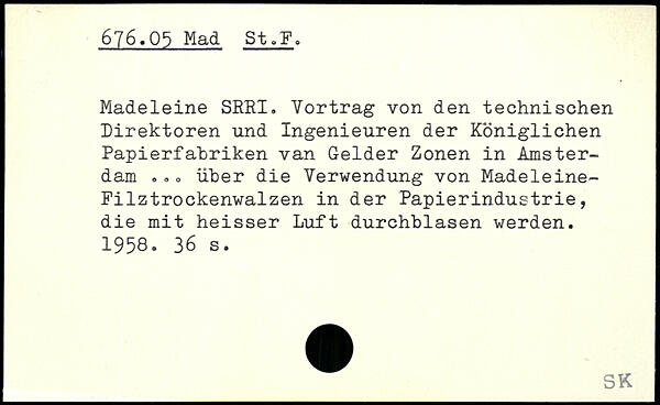Madeleine SRRI. Yortrag von den technischen Direktoren und Ingenieuren der Königlichen Papierfabriken van Gelder Zonen in Amsterdam. <, o über die Verwendung von Madeleine-Pilztrockenwalzen in der Papierindustrie, die mit heisser Luft durchblasen werden. 1958.