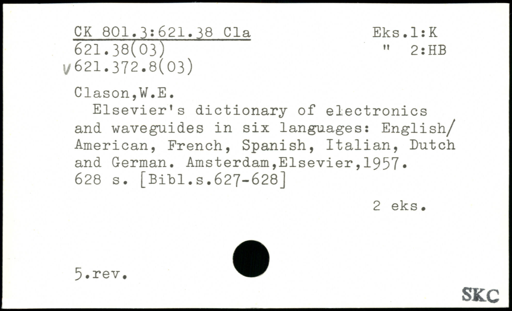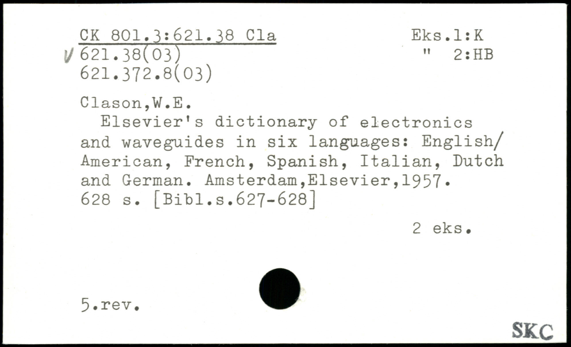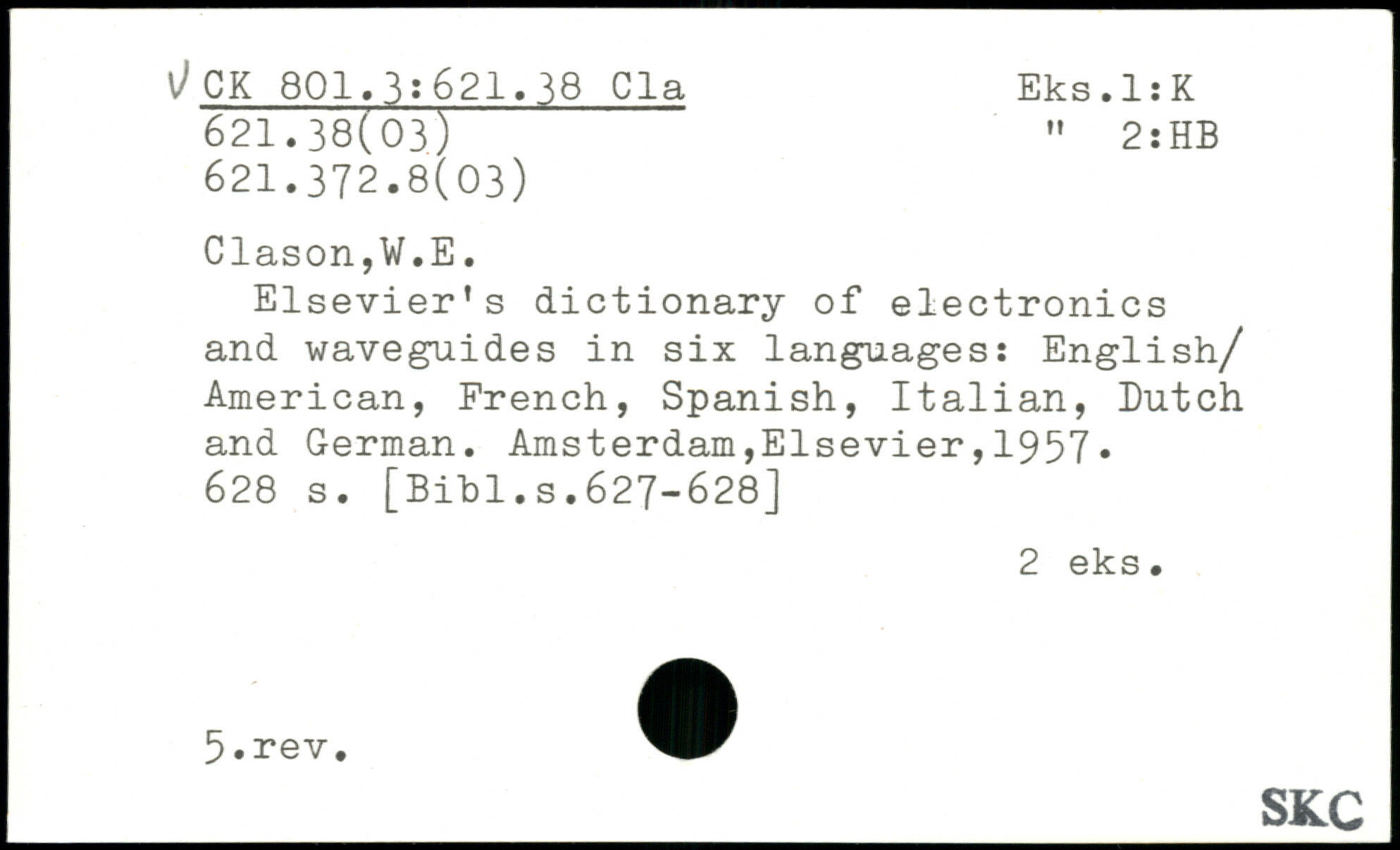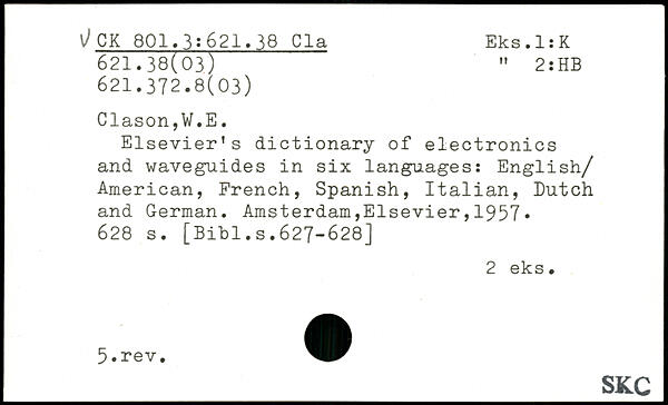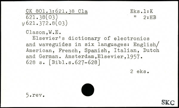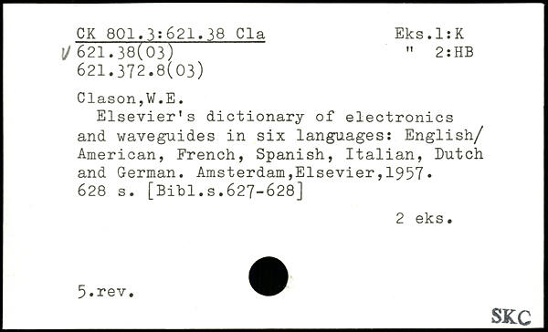 Elsevier’s dictionary of electronics and waveguides in six languages: English/ American, French, Spanish, Italian, Dutch and German.