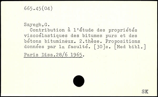 Contribution à l'étude des propriétés viscoélastiques des bitumes purs et des bétons bitumineux. 2.thèse. Propositions données par la faculté. [30]s. [Med bibl.] Paris Diss.28/6 1965.