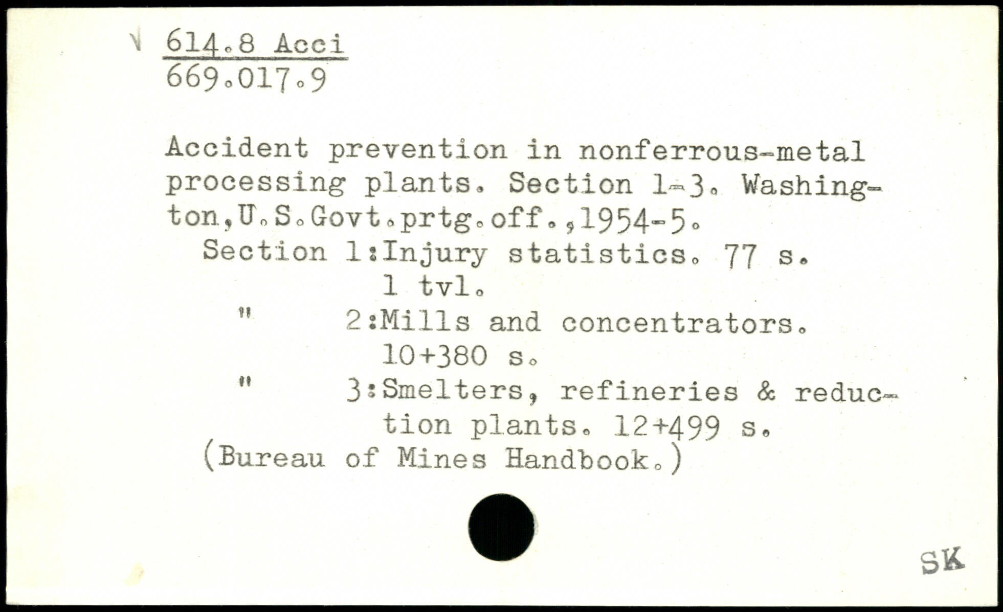 Accident prevention in nonferrous-metal processing plants. Section 1.3, Washing-ton,ü.S.Govt.prtg. off. 91954-5 , Section 1:Injury statistics.