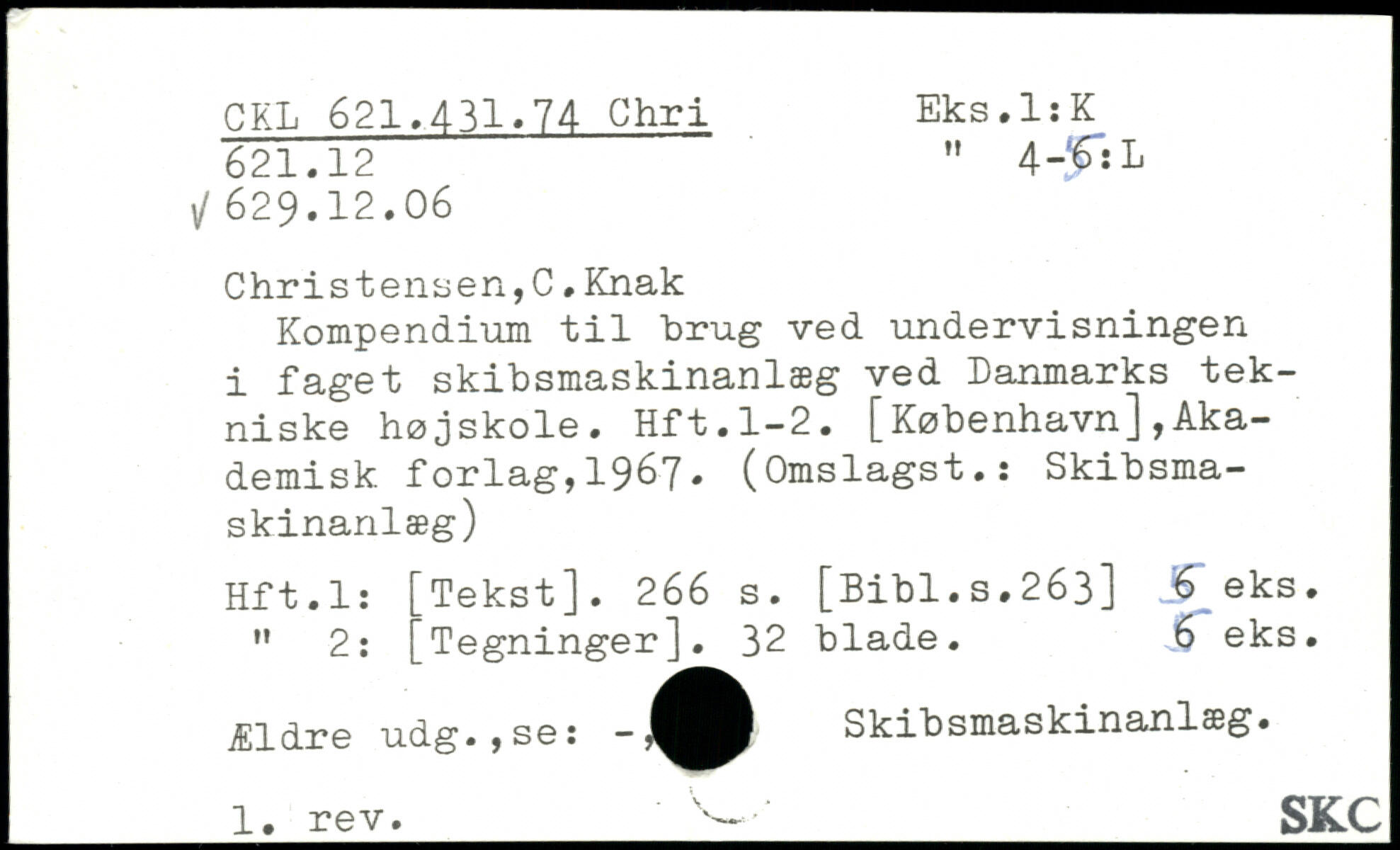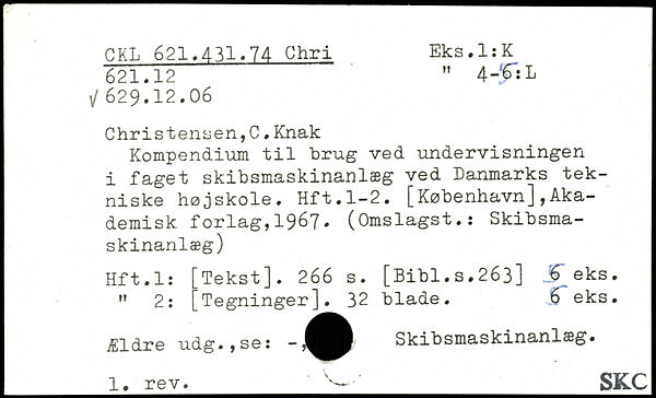 Christensen,C.Knak Kompendium til brug ved undervisningen i faget skibsmaskinanlasg ved Danmarks tekniske højskole. Hft.1-2. [København],Akademisk forlag,1967.