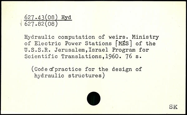 Hydraulic computation of weirs. Ministry of Electric Power Stations [MÉS] of the U.S.S.R. Jerusalem,Israel Program for Scientific Translations,1960.