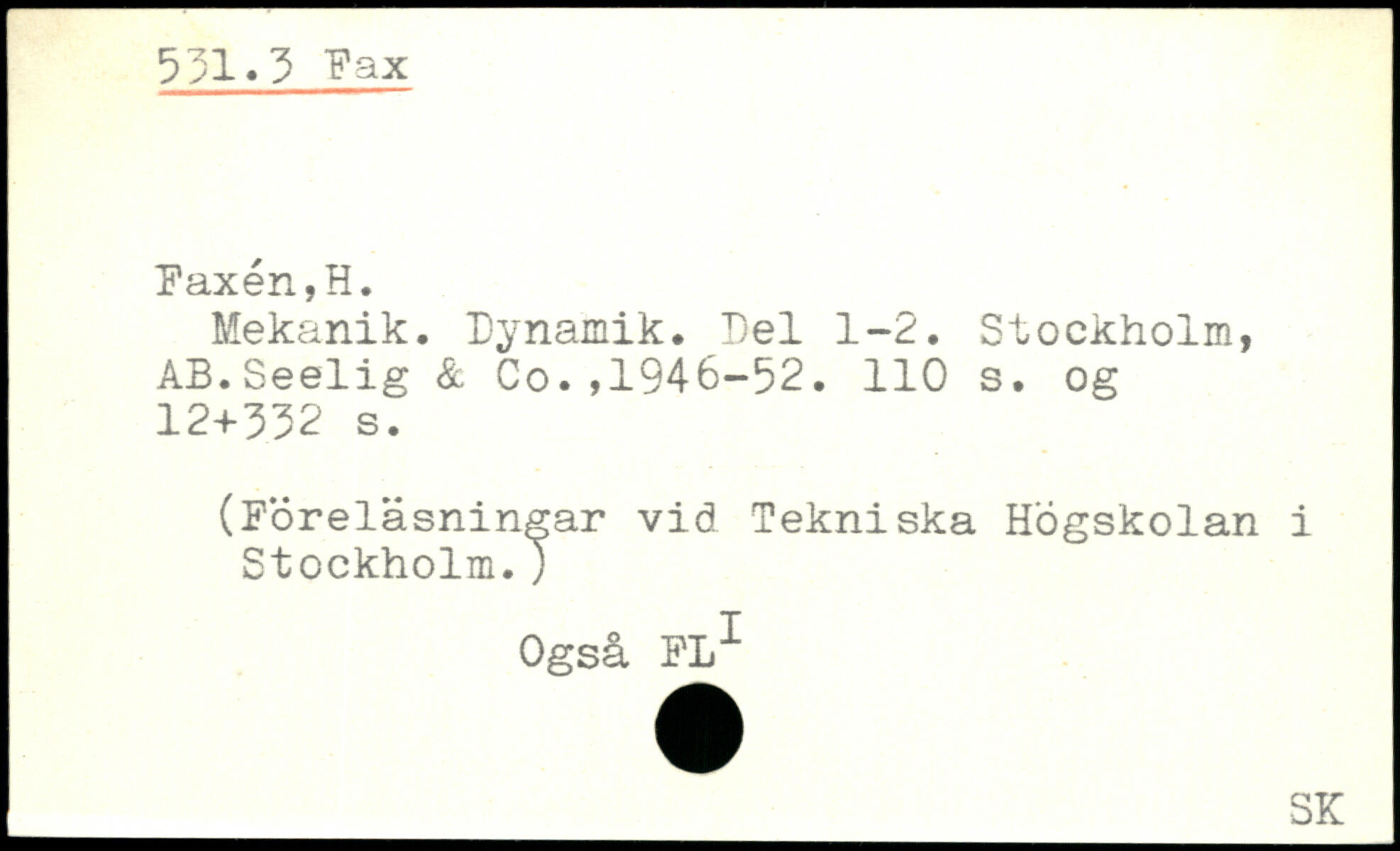 Mekanik. Dynamik. Del 1-2. Stockholm, AB.Seelig & Co.,1946-52.