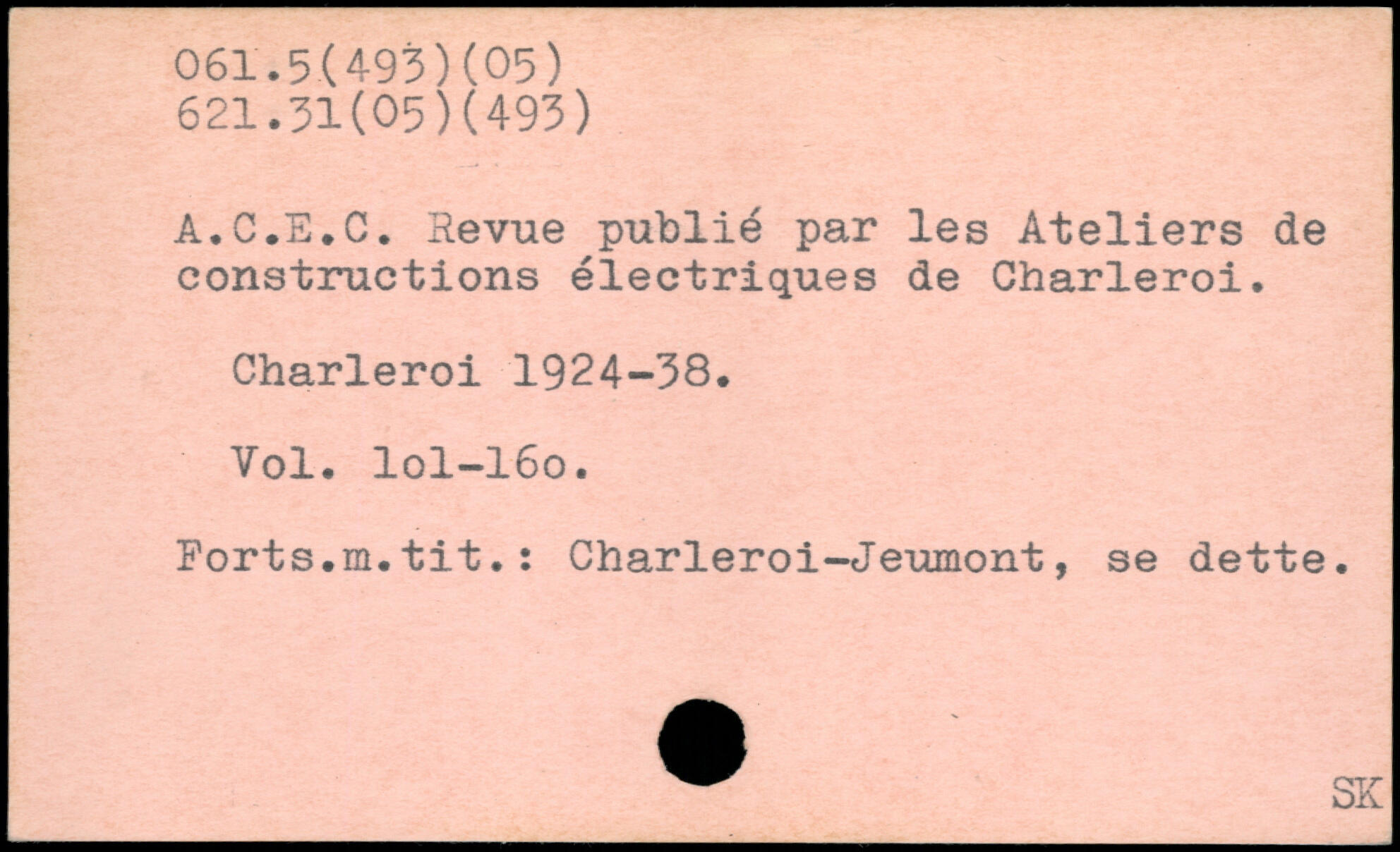 A.C.E.C. Revue publié par les Ateliers de constructions électriques de Charleroi. Charleroi 1924-38. Vol. I0I-I60. Forts.m.tit.: Charleroi-Jeumont, se dette.