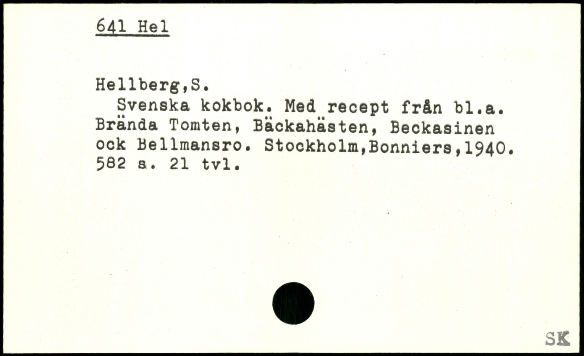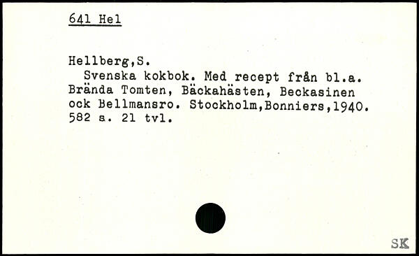 Svenska kokbok. Med recept från bl.a. Brända Tomten, Bäckahästen, Beckasinen ock Bellmansro.