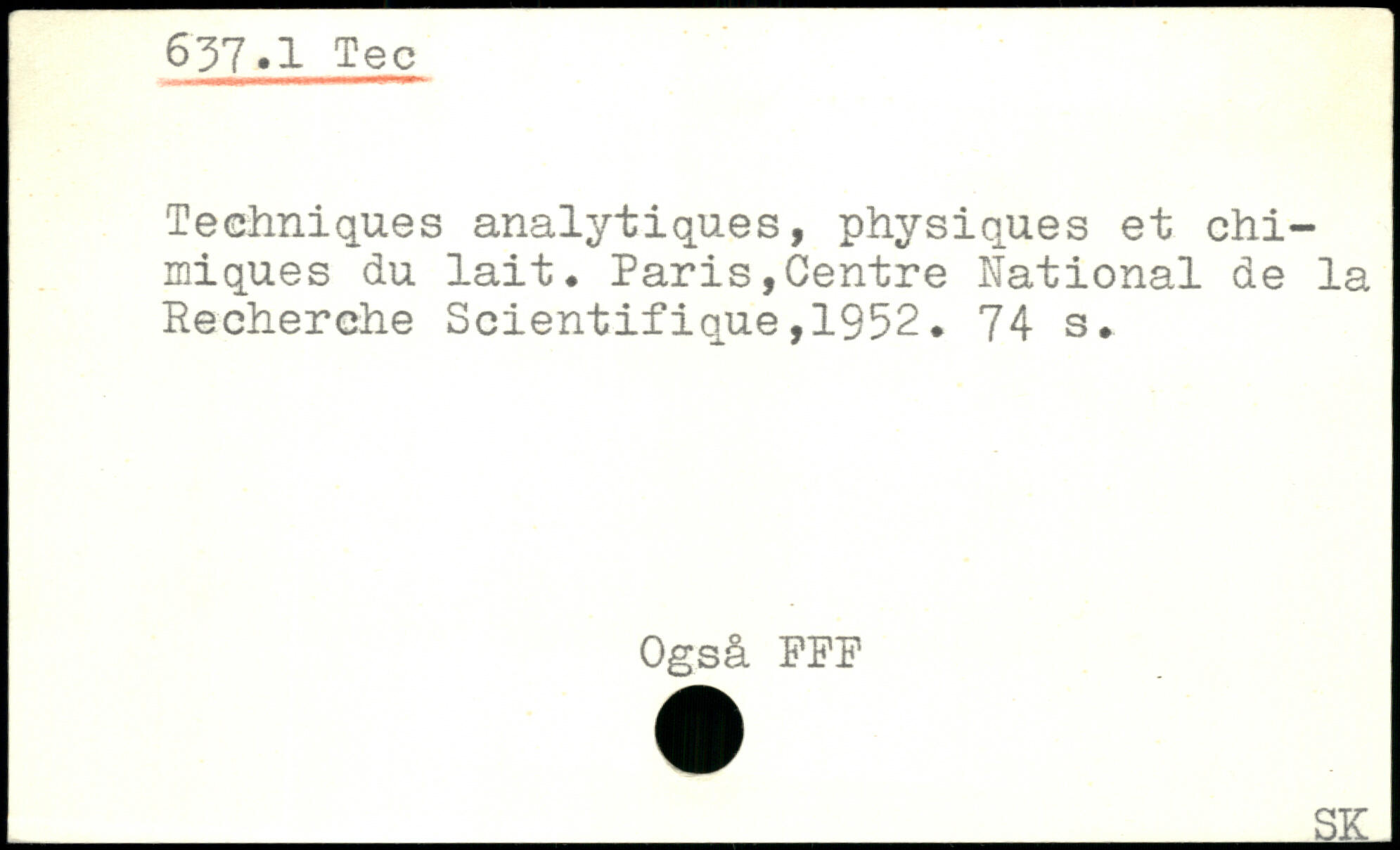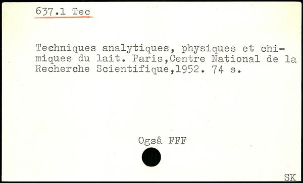 Techniques analytiques, physiques et chimiques du lait. Paris,Centre National de la Recherche Scientifique,1952.