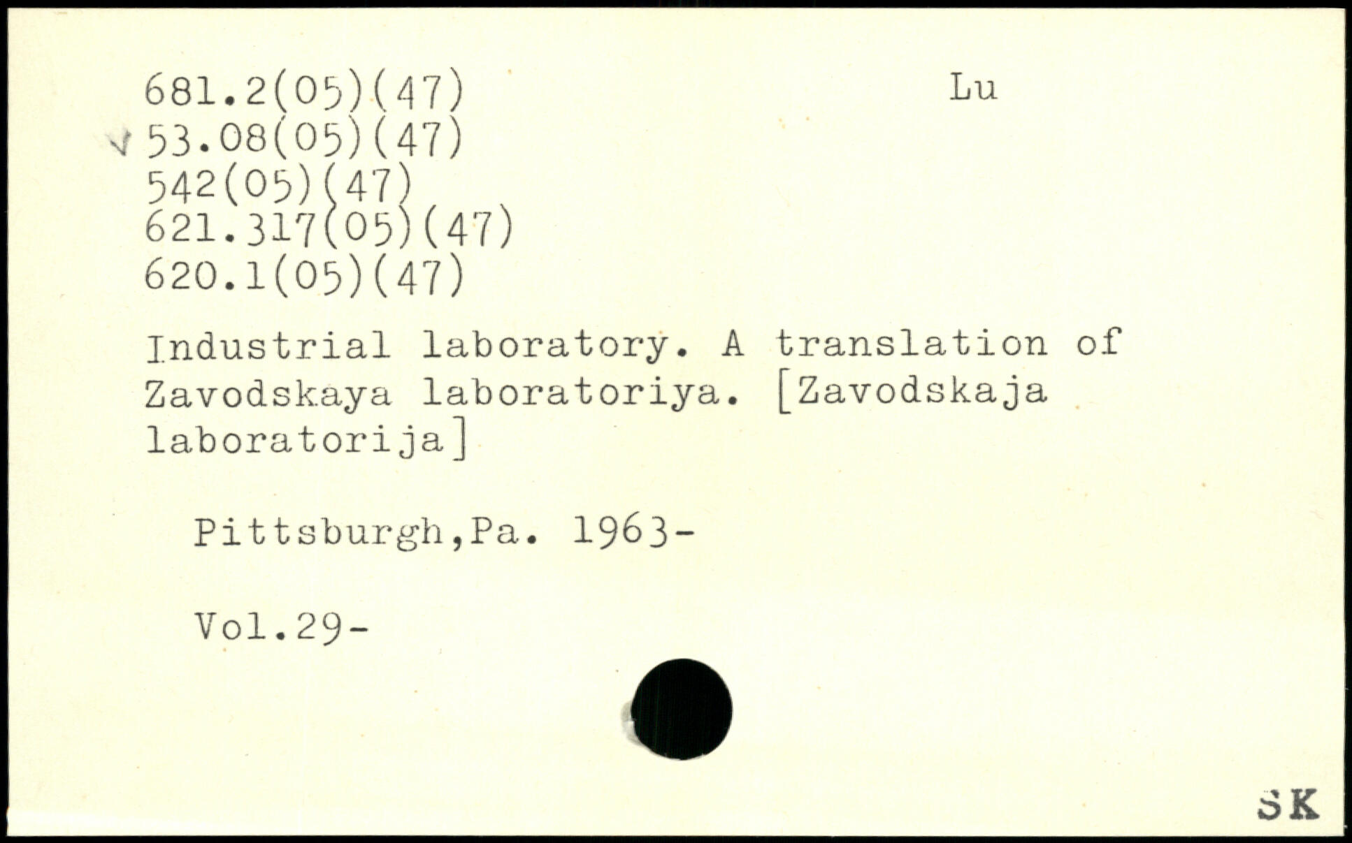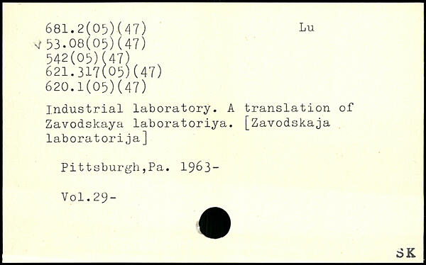 Industrial laboratory. A translation of Zavodskaya laboratoriya.