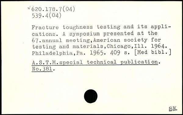 Fracture toughness testing and its applications. A symposium presented at the 67.annual meeting,American society for testing and materials,Chicago,111. 1964. Philadelphia,Pa. 1965-