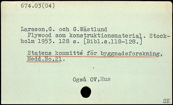 Lars son, G, och Gr.?/ästlund Plywood som konstruktionsmaterial. Stock-holm 1953.