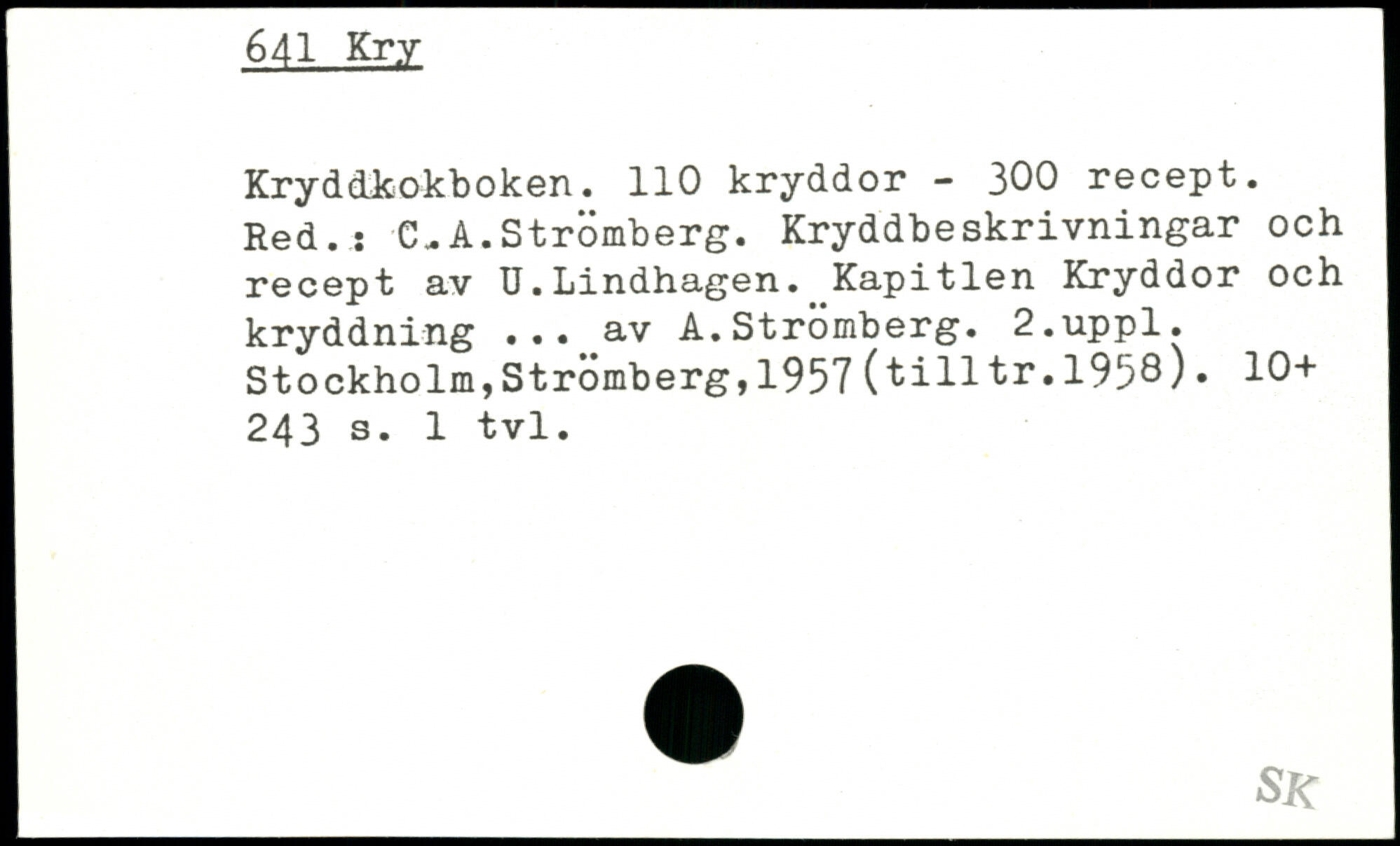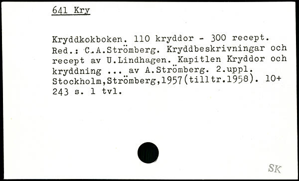 Kryddkokboken. 110 kryddor - 300 recept. Hed.: C.A.Strömberg. Kryddbeskrivningar och recept av U.Lindhagen.^Kapitlen Kryddor och kryddni-ng ... av A. Strömberg.