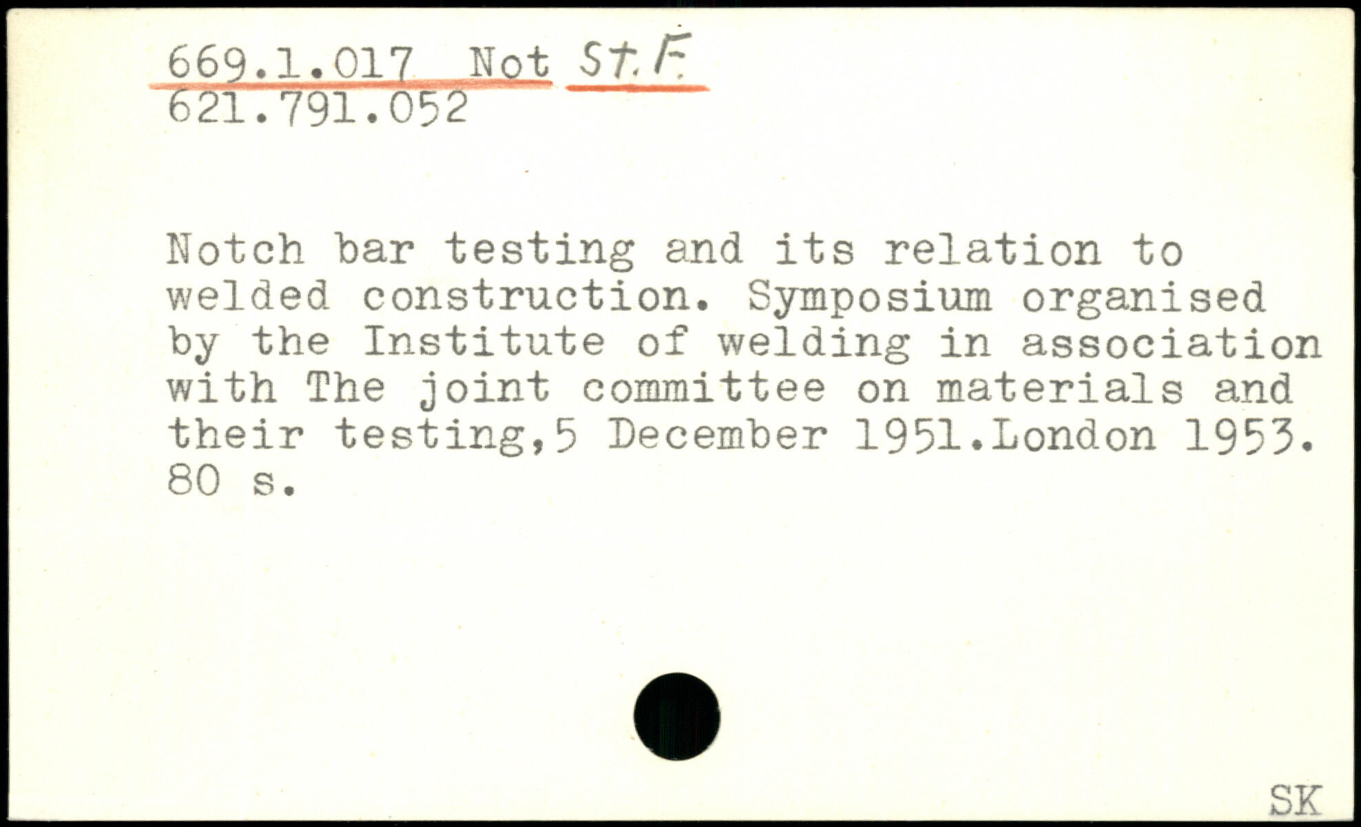 Notch bar testing and its relation to welded construction. Symposium organised by the Institute of welding in association with The joint committee on materials and their testing,5 December 1951.