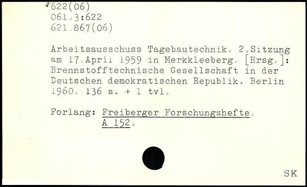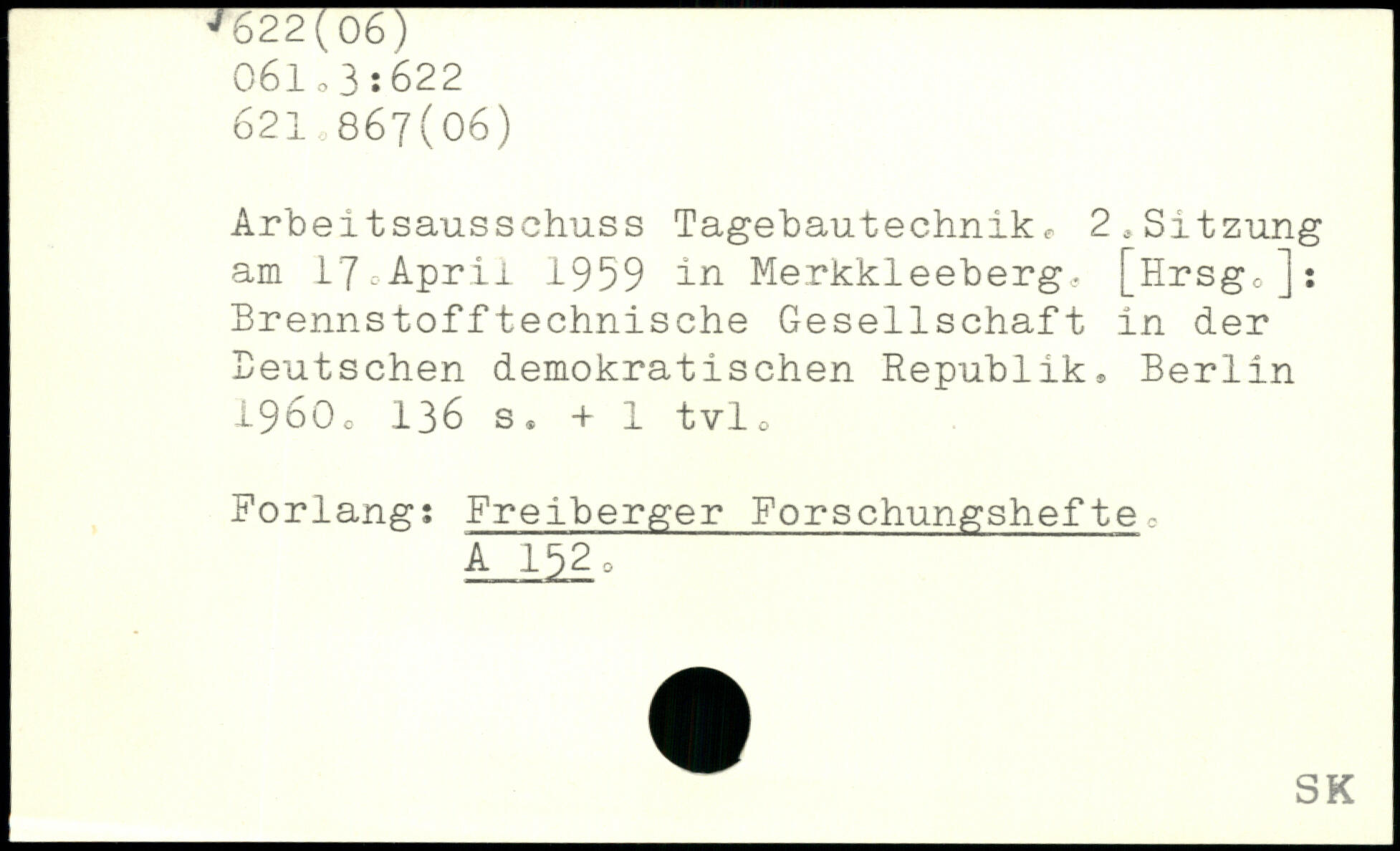 Arbeitsausschuss Tagebautechnik. 2.Sitzung am 17 April 1959 in Merkkleeberg, [Hrsg,]: Brennstofftechnische Gesellschaft in der Deutschen demokratischen Republik