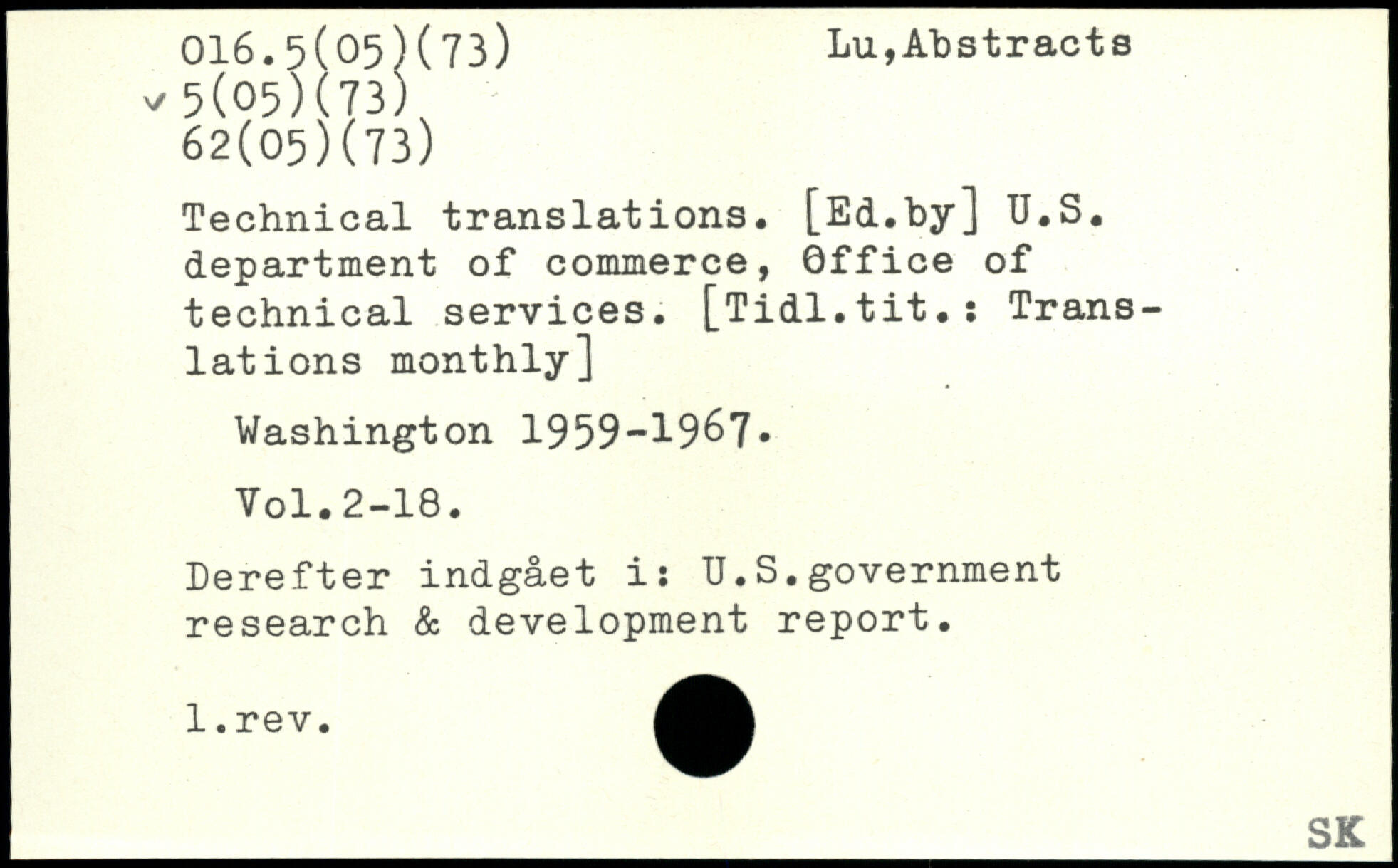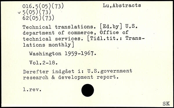 Technical translations. [Ed.by] U.S. department of commerce, Øffice of technical services. [Tidl.tit.: Translations monthly]