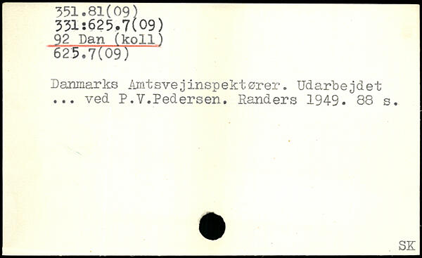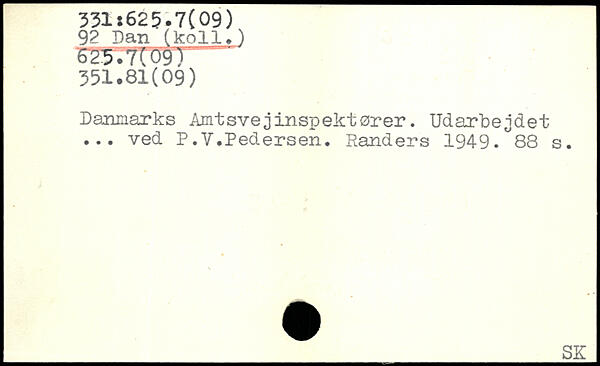 92 Dan (koli.) 625.7t 091 351.81(09) Danmarks Amtsvejinspektører. Udarbejdet ... ved P.V.Pedersen. Randers 1949.^