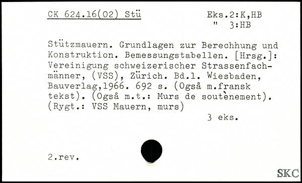 Stützmauern. Grundlagen zur Berechhung und Konstruktion. Bemessungstabellen. [Hrsg.]: Vereinigung schweizerischer Strassenfach-männer, (VSS), Zürich. Bd.l.