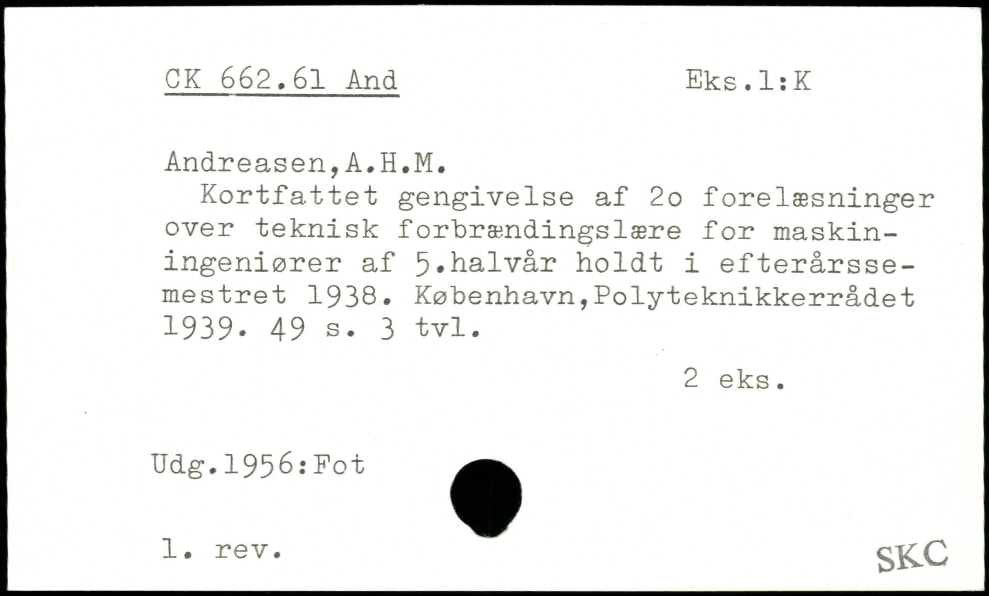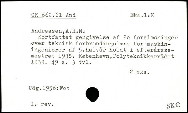 Kortfattet gengivelse af 2o forelæsninger over teknisk forbrændingslære for maskiningeniører af 5,halvår holdt i efterårssemestret 1938. København,Polyteknikkerrådet 1939.