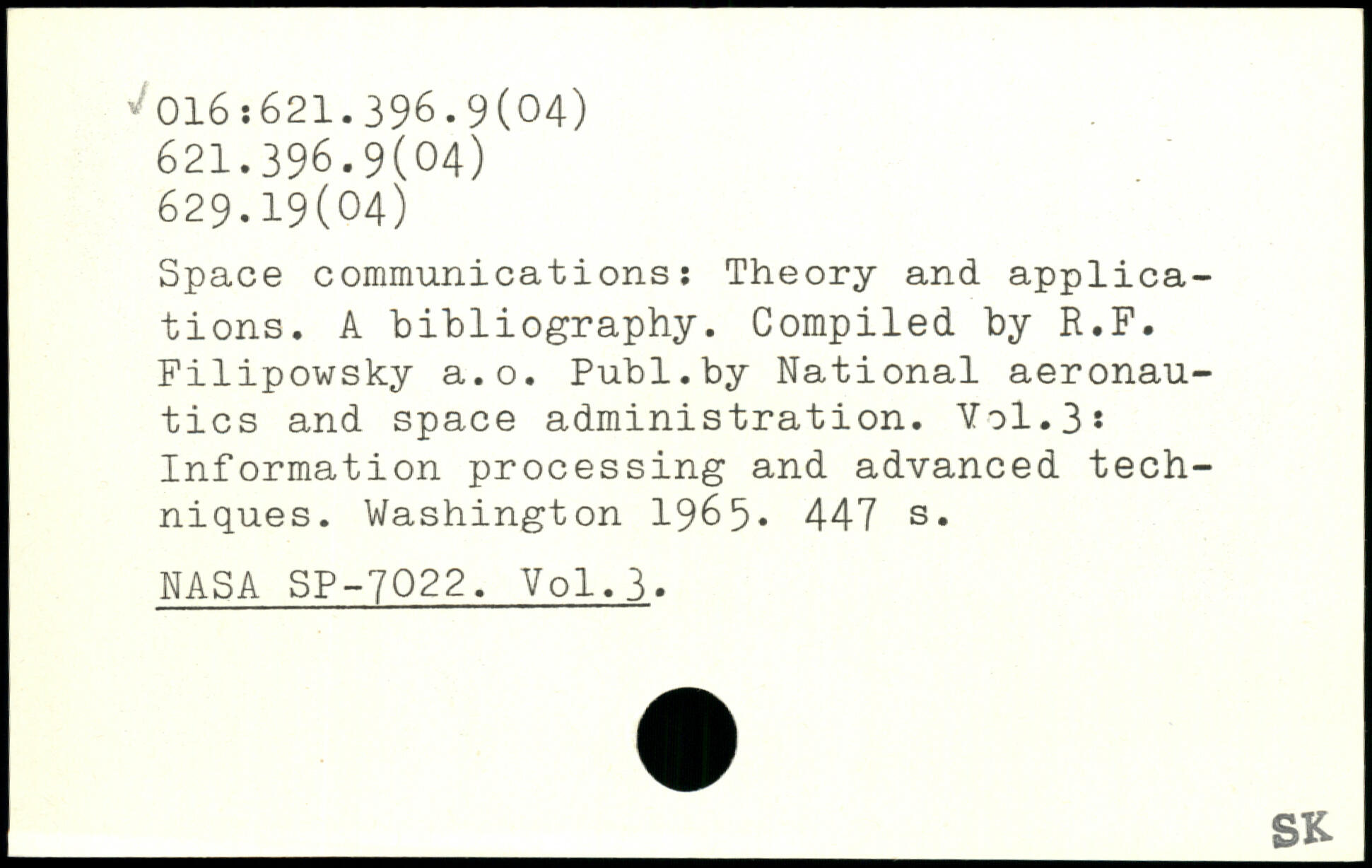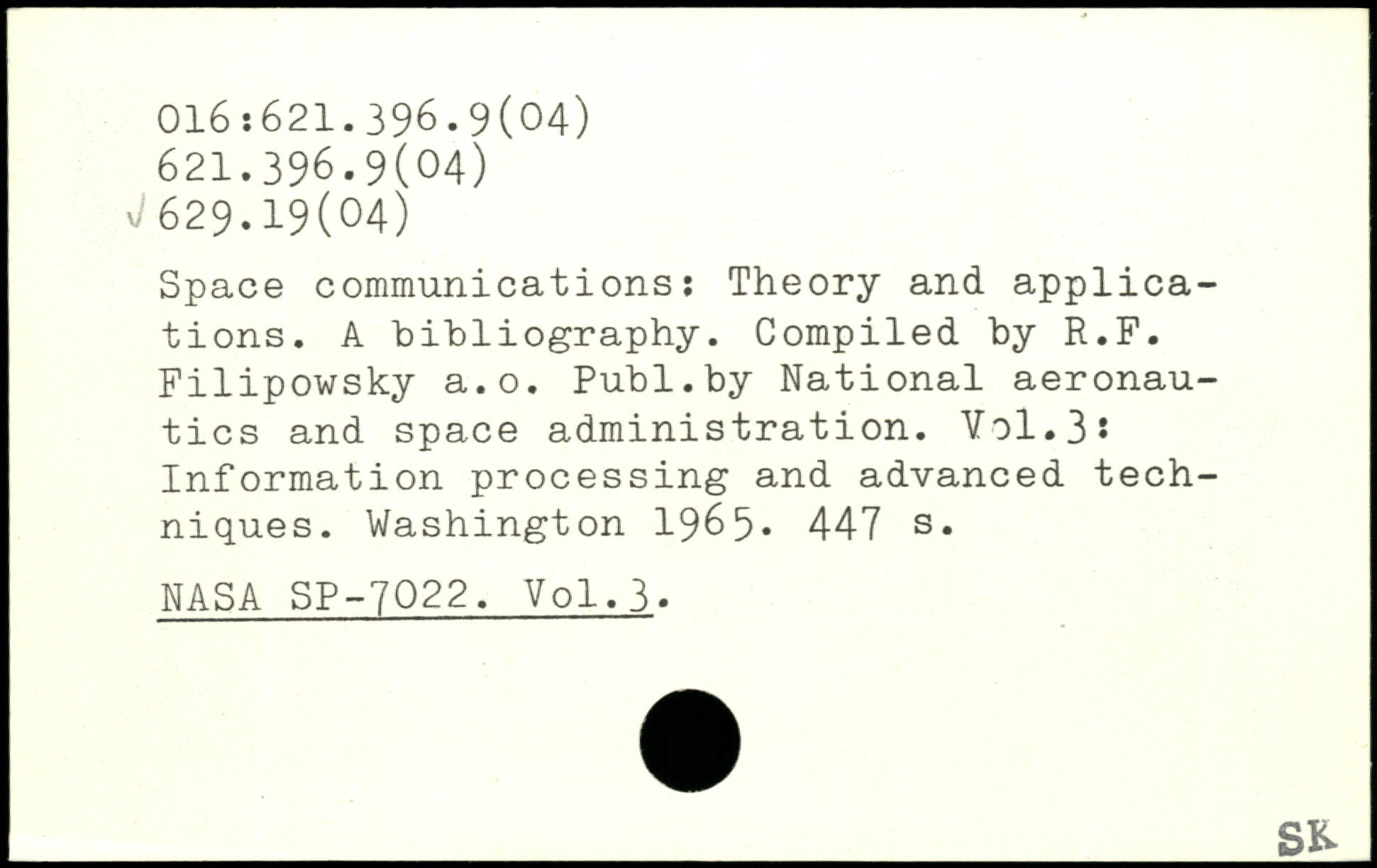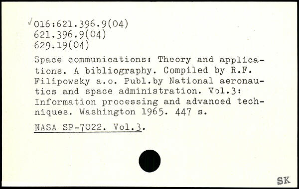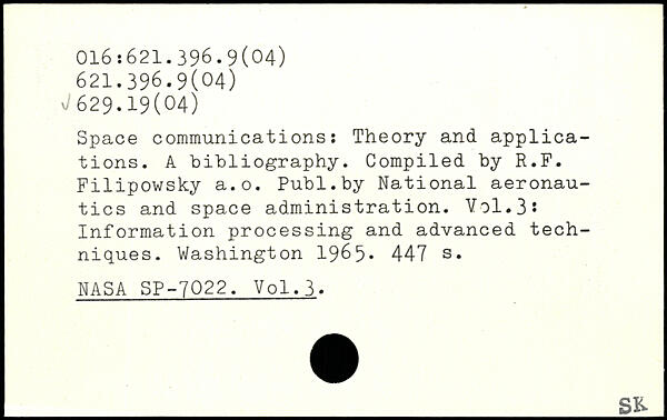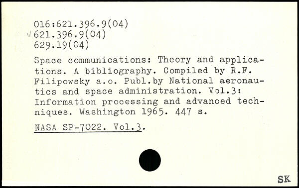 Space communications: Theory and applications. A bibliography. Compiled by R.F. Filipowsky a.o.