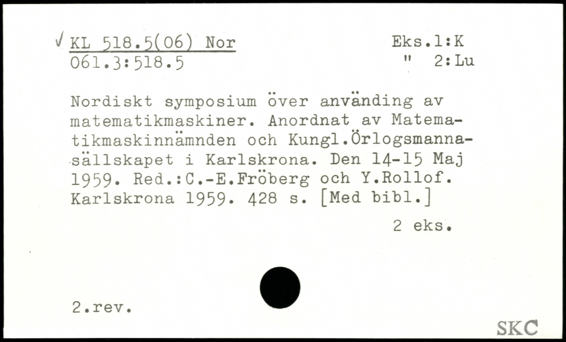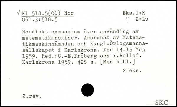 Nordiskt symposium över anvanding av matematikmaskiner. Anordnat av Matematikmaskinnämnden och Kungl.Örlogsmanna-sällskapet i Karlskrona. Den 14-15 Maj 1959. Red.:G.-E.Fröberg och Y.Rollof. Karlskrona 1959.